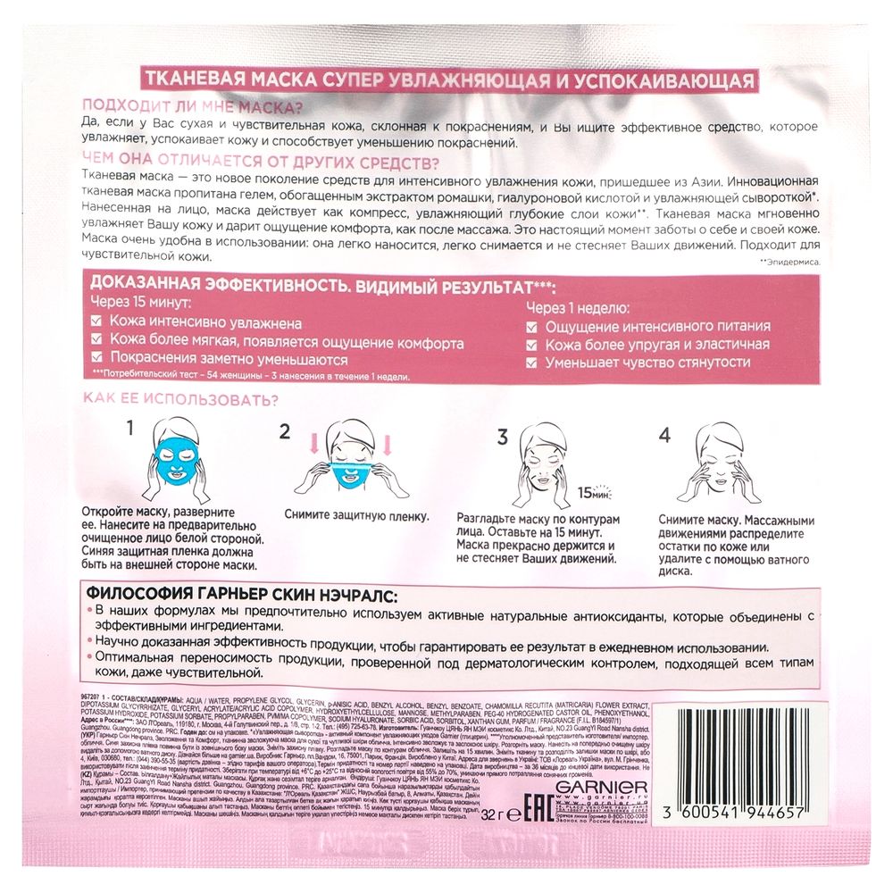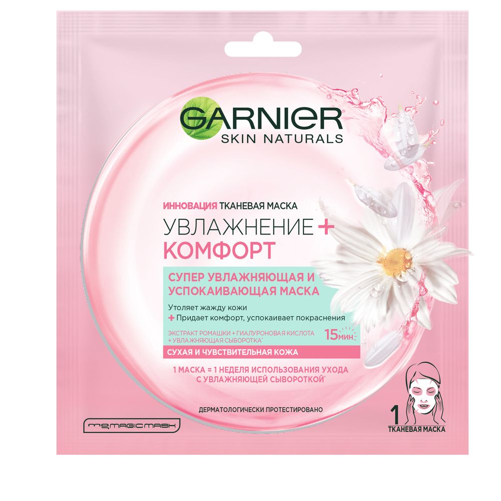 Garnier Тканевая маска для лица "Увлажнение + Комфорт" с гиалуроновой, П-Анисовой кислотами, экстрактом ромашки, супер увлажняющая и успокаивающая, для сухой и чувствительной кожи, 32гр.