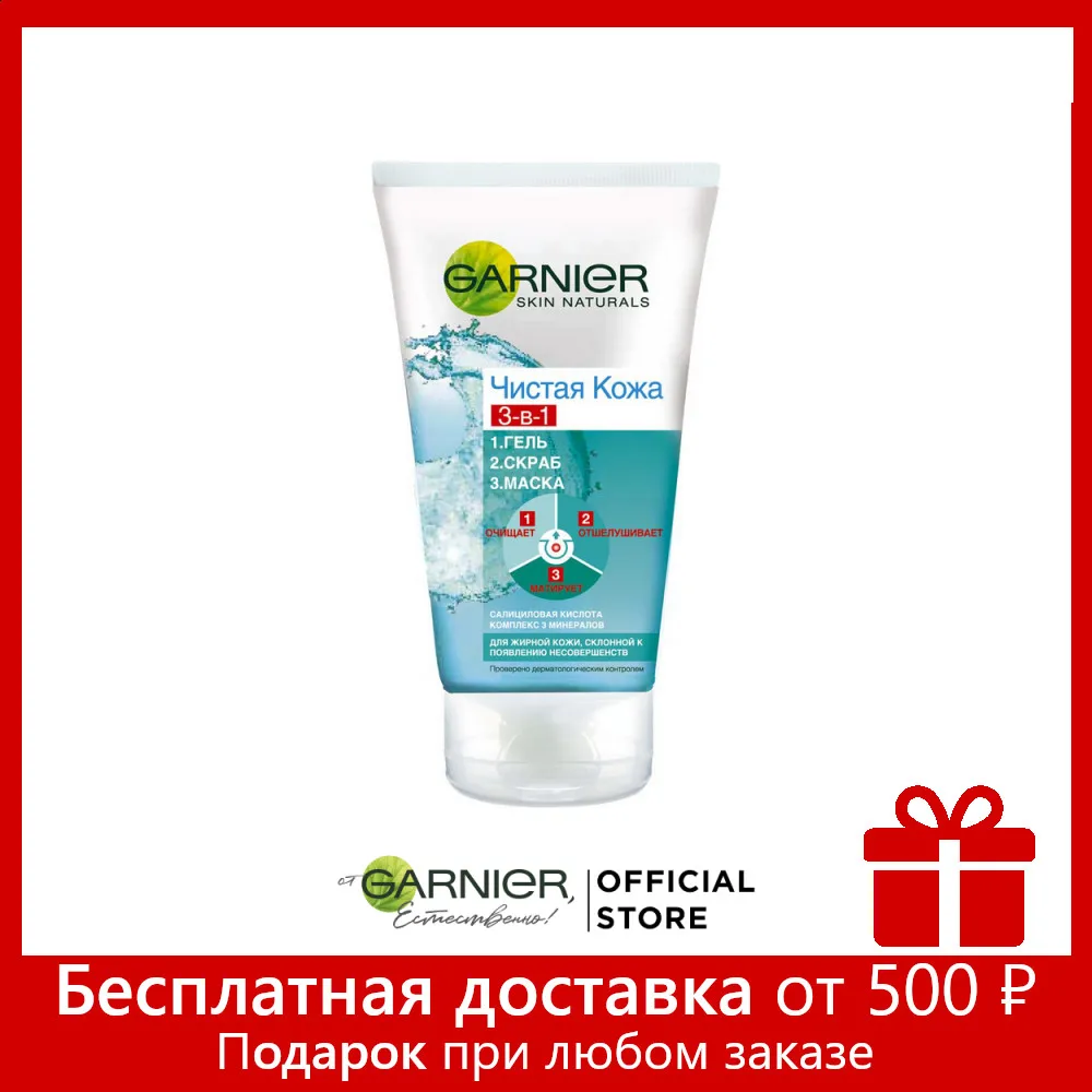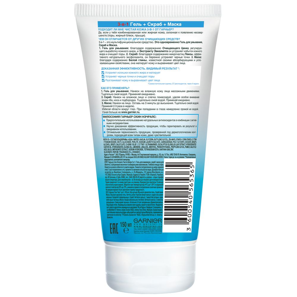 Garnier Гель + Скраб + Маска для лица "Чистая Кожа" 3-в-1 с экстрактом эвкалипта, цинком и салициловой кислотой, против прыщей, черных точек и жирного блеска, для проблемной жирной и комбинированной кожи, 150 мл
