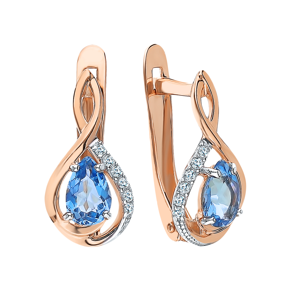 Описание | Серьги с 2 топазами голубыми, 0.91 карат; фианит; розовое золото 585 пробы. |