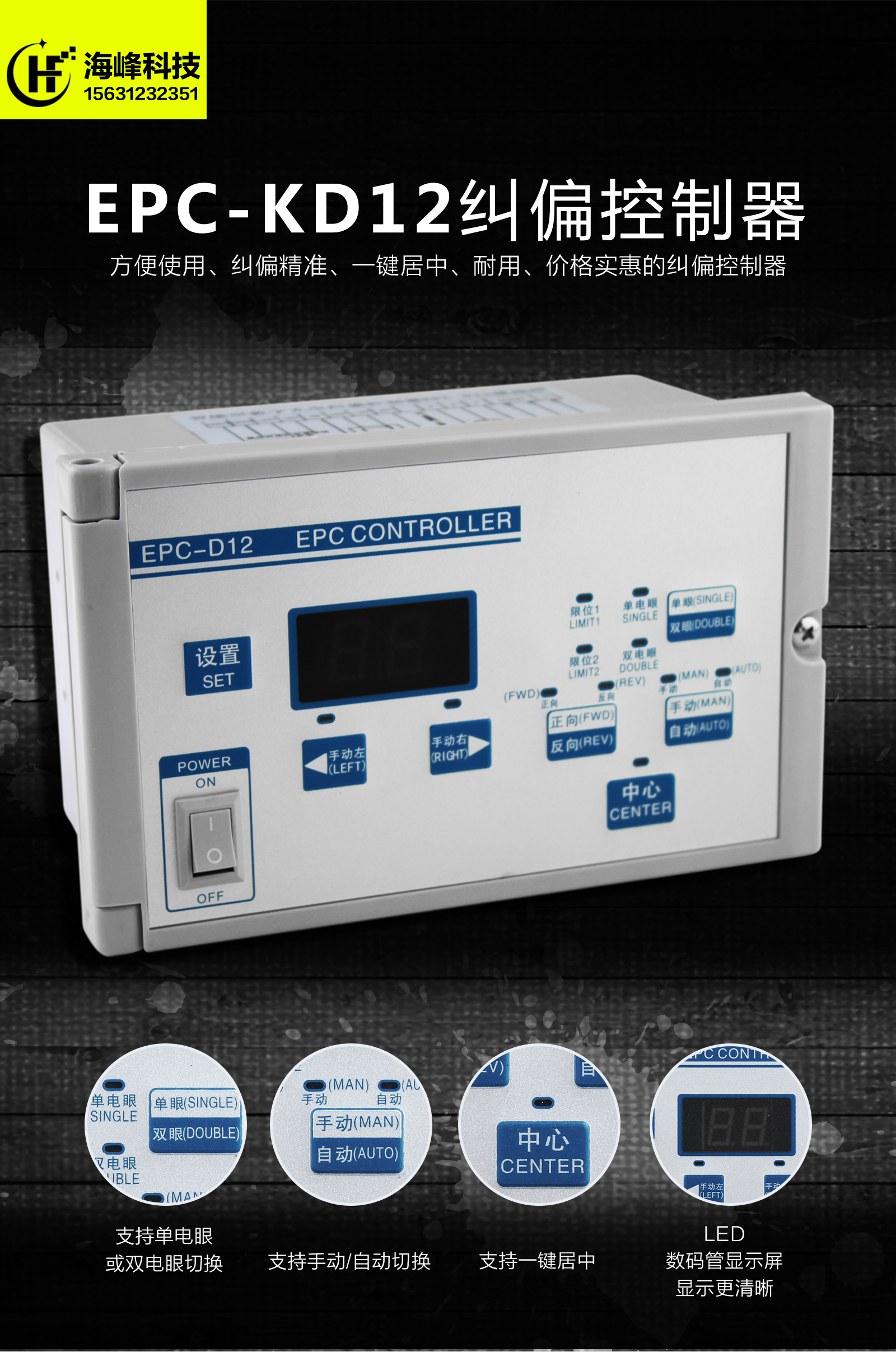 EPC-KD12 is a new upgraded version of the correction controller, without the need for an external midpoint limit switch, it can realize one-key centering function (need to connect the left and right limit switches), the sensitivity of the single sensor is 50 adjustable, and the limit alarm has a relay. The output port can be connected with an external control button to realize remote control, and it can cooperate with an NPN switch sensor (single sensor or double sensor) synchronous motor actuator to form a stable and reliable correction system.