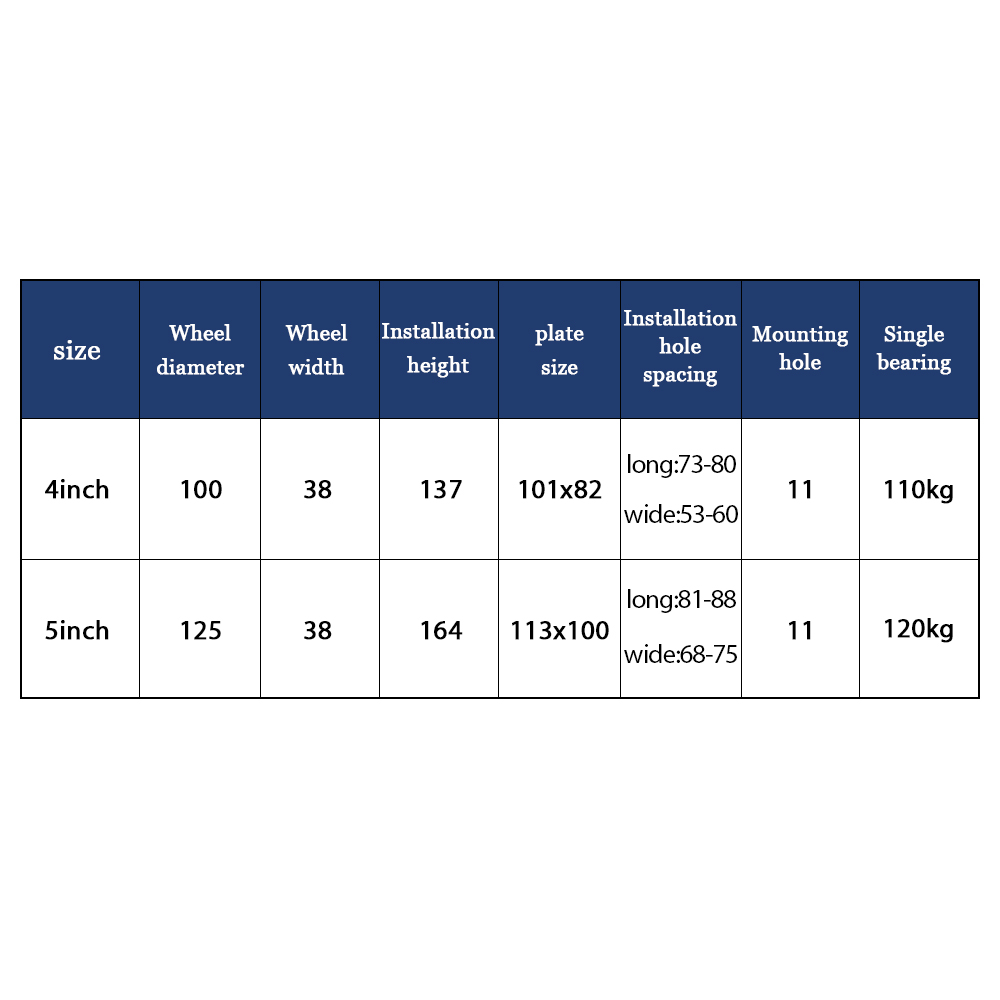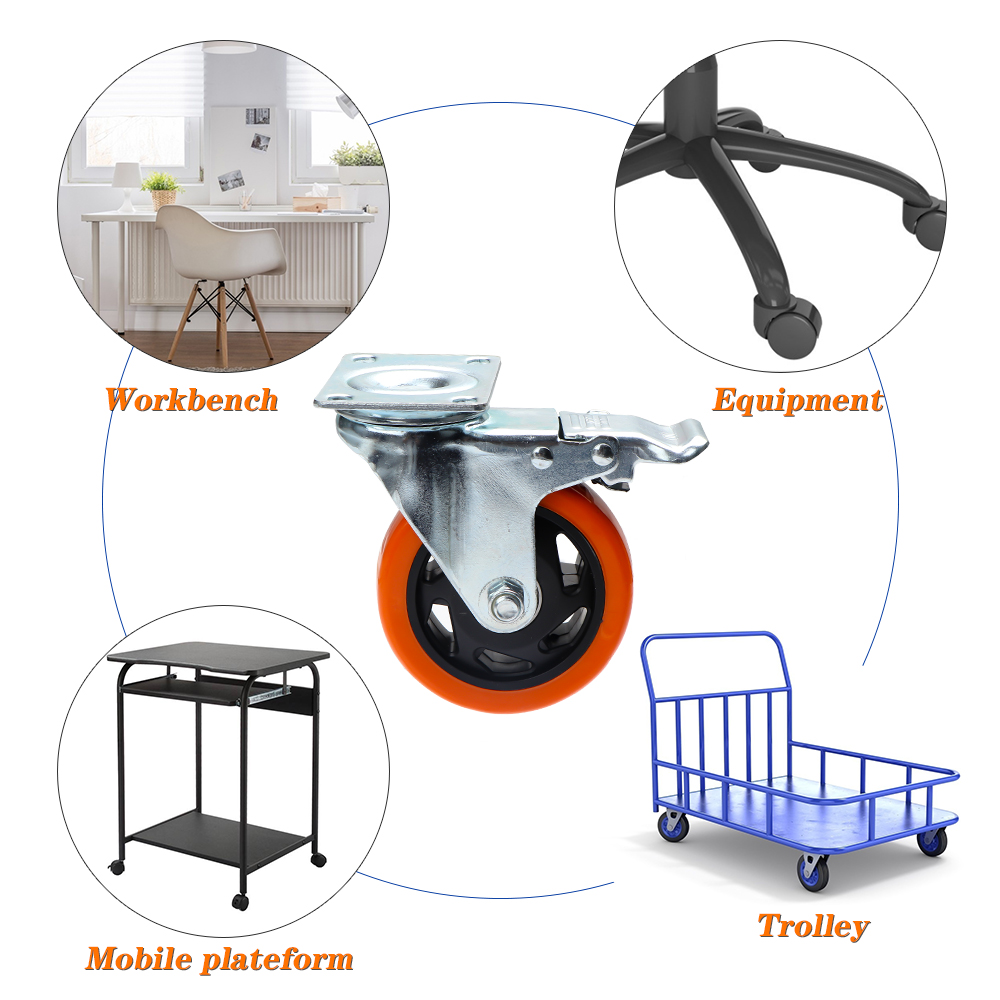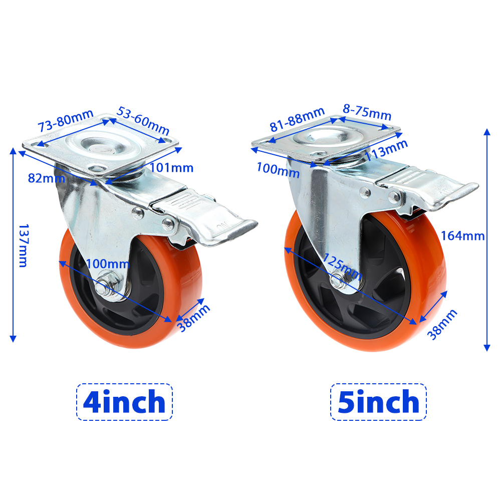 Тип изделия: 4 дюйма/5 дюймов Материал колес: полиуретан Место применения: логистический транспорт, Складская фабрика, морской причал, дом, офис, кровать госпитаи, супермаркет 1. Колесо изготовлено из полиуретанового материала, который является огнестойким, водонепроницаемым, морозостойким, устойчивым к трещинам, устойчивым к высоким температурам и светильник ким по весу. 2. Утолщенная стальная пластина, высокая несущая способность, стабильная и долговечная. Нескользящая гайка, Высокая долговечность. 3. Колесо обладает отличной износостойкостью, не царапает пол. 4. Широкий спектр применения: может применяться в электрическом автоматическом оборудовании, компьютерных опорах, аппаратах связи и т. д. Особенно подходит для сверхмощных машин, заводской обработки, складской логистики, обработки большого оборудования и т. д.