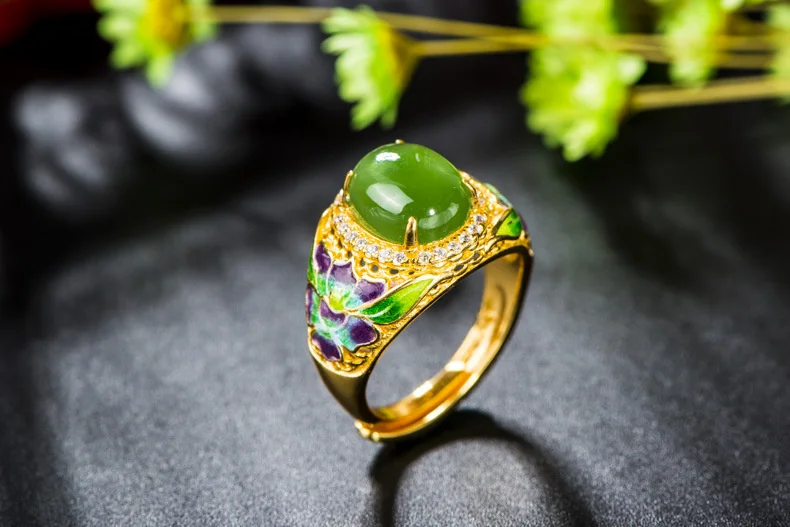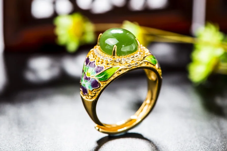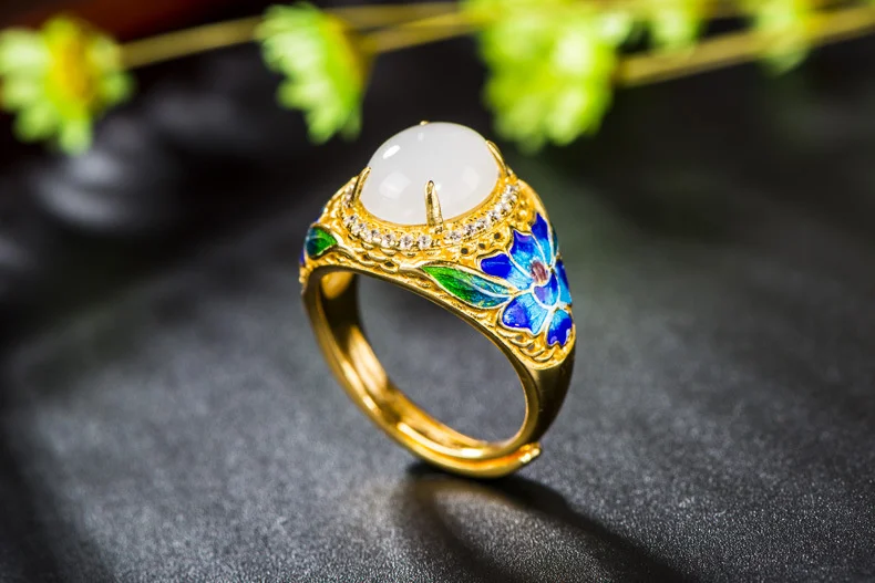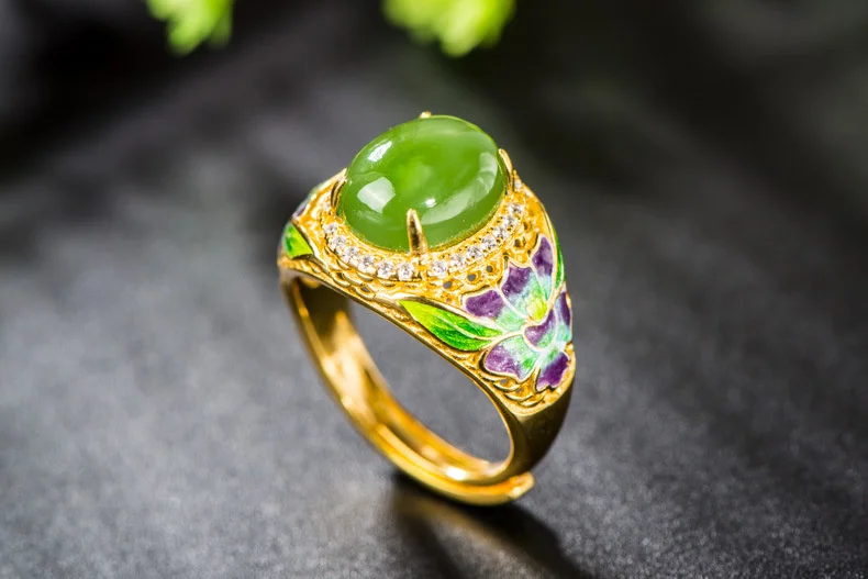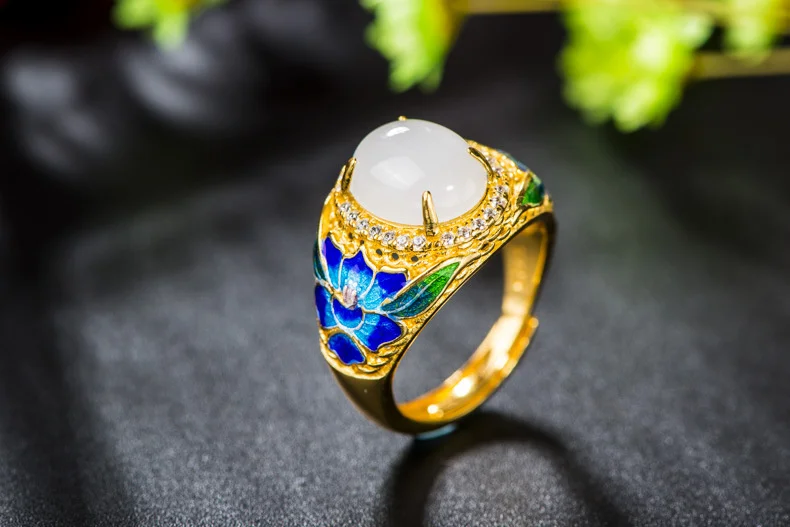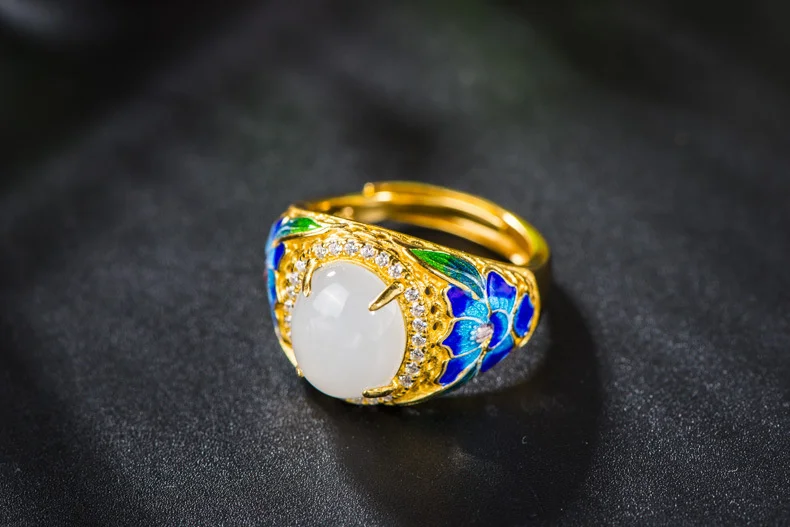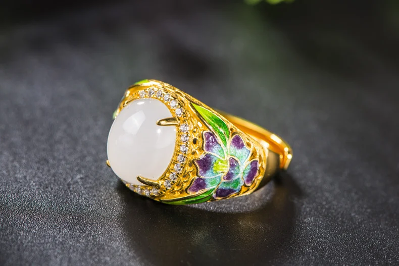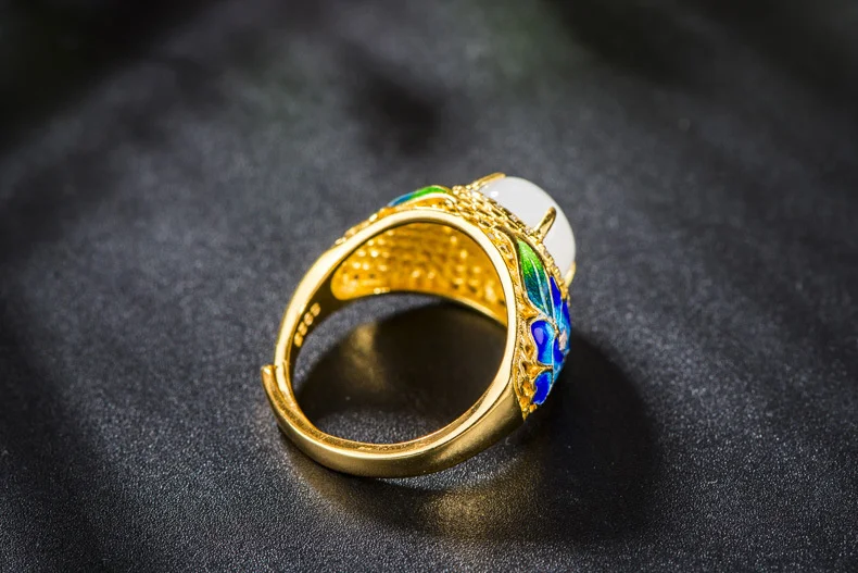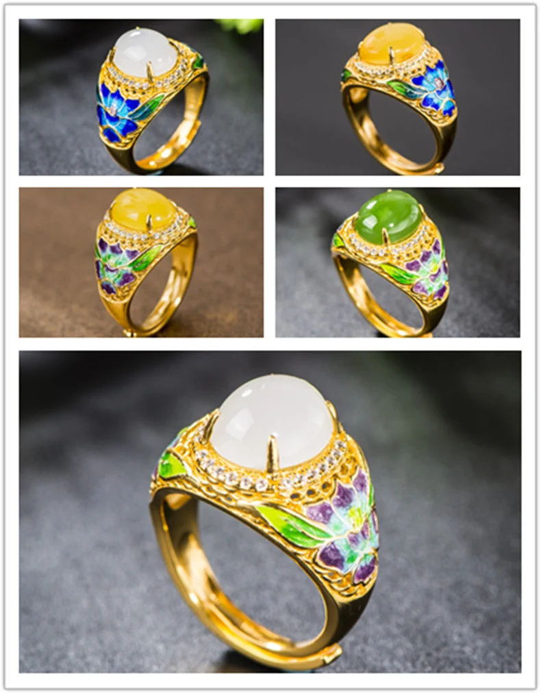 925 пробы серебро (Hetian) нефрита, белые Jade Jasper Янтарный клуазоне Бусина в виде цветка пиона с золотым покрытием с изменяемым размером КОЛЬЦО