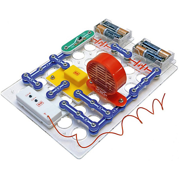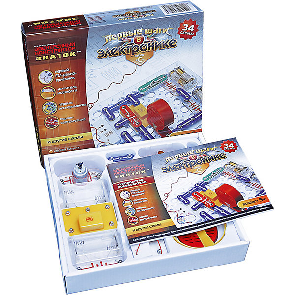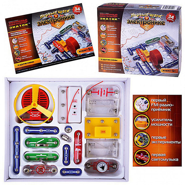 • в комплекте: 34 схемы, радиоприемники, электродвигатели, звуковые динамики, усилители мощности, светодиоды, резисторы и транзисторы, электролампы, выключатели, проводники;