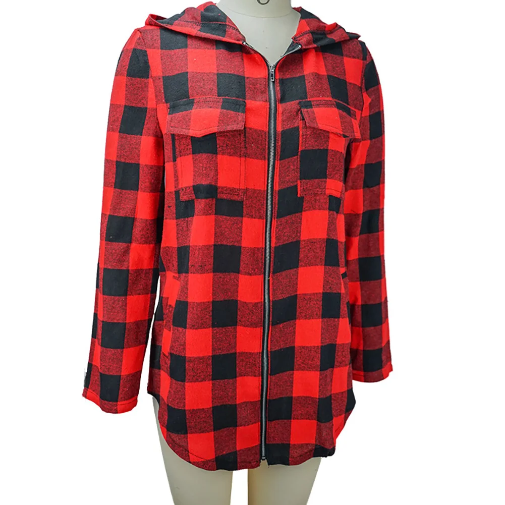 Повседневная Женская Полосатая клетчатая куртка с карманами на груди и длинным рукавом, толстовка на молнии, рубашка, Топ