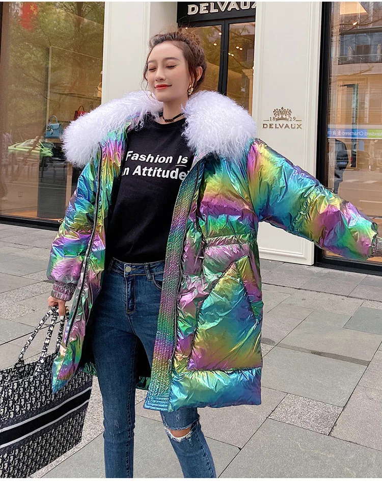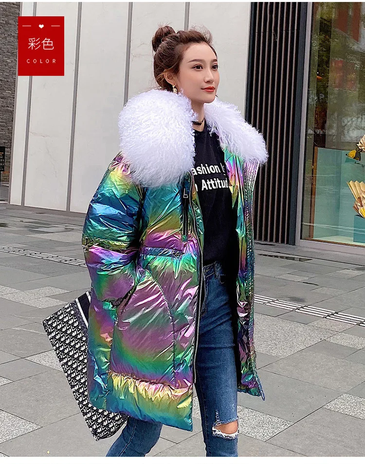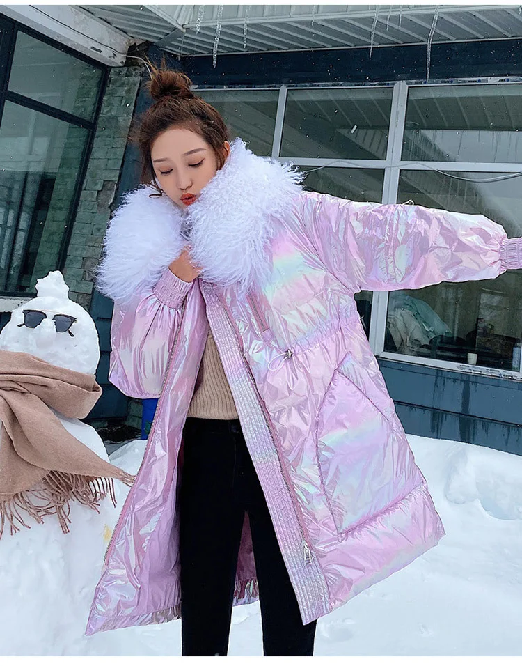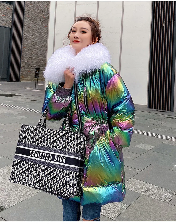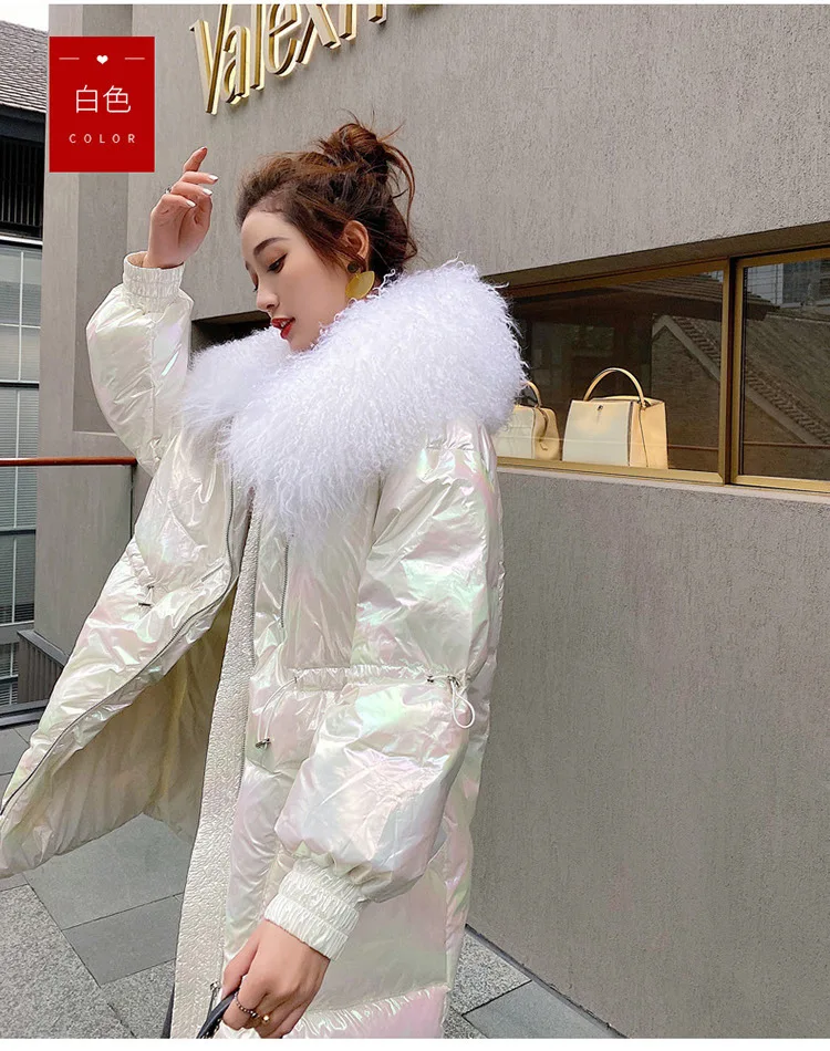 Модные зимние женские длинные блестящие Серебристые пуховики с большим