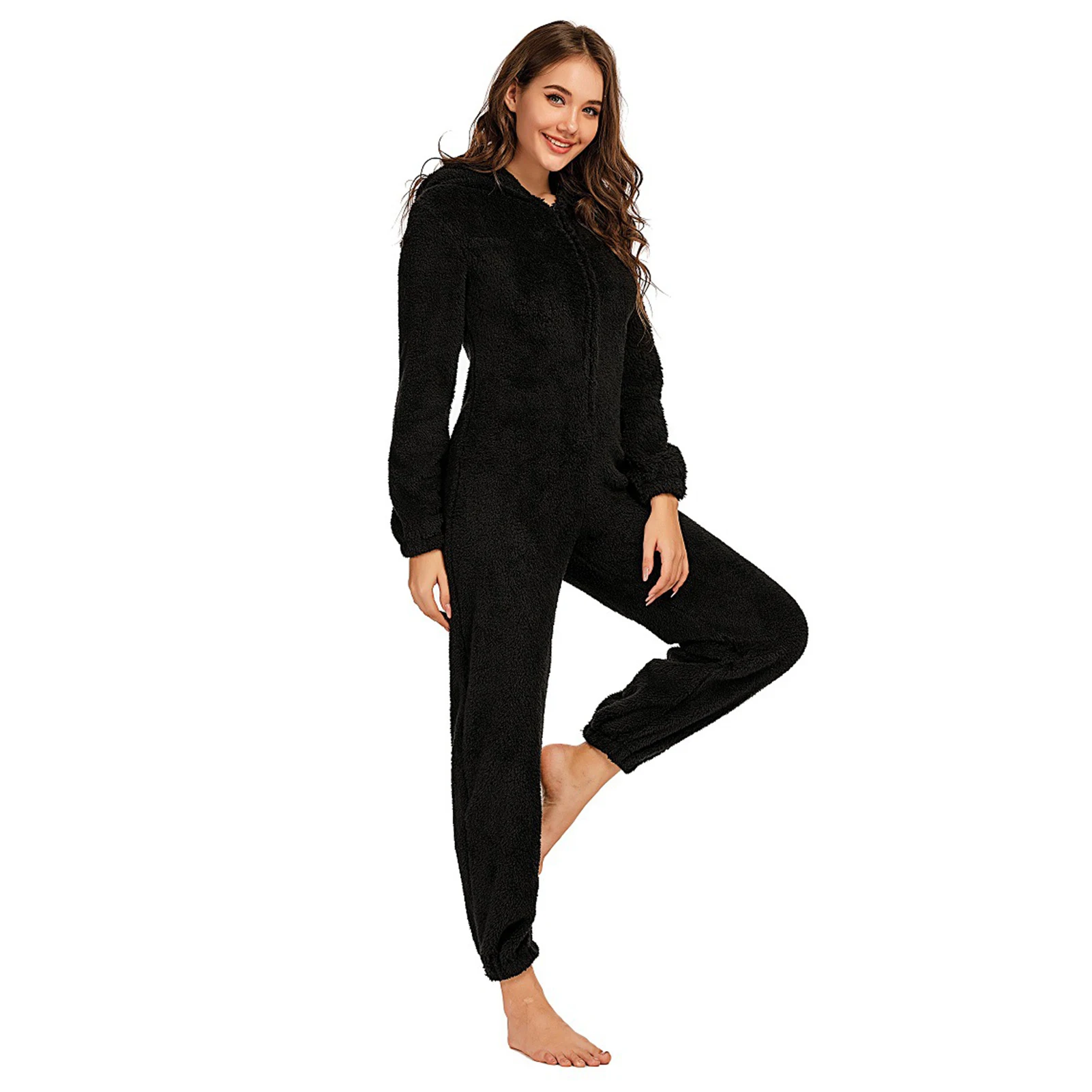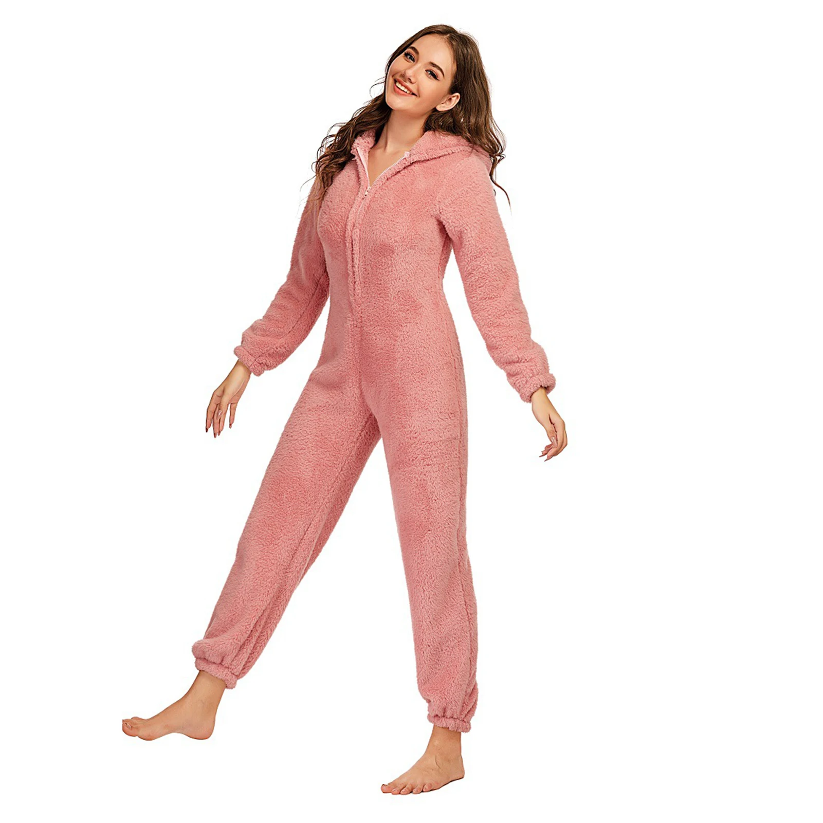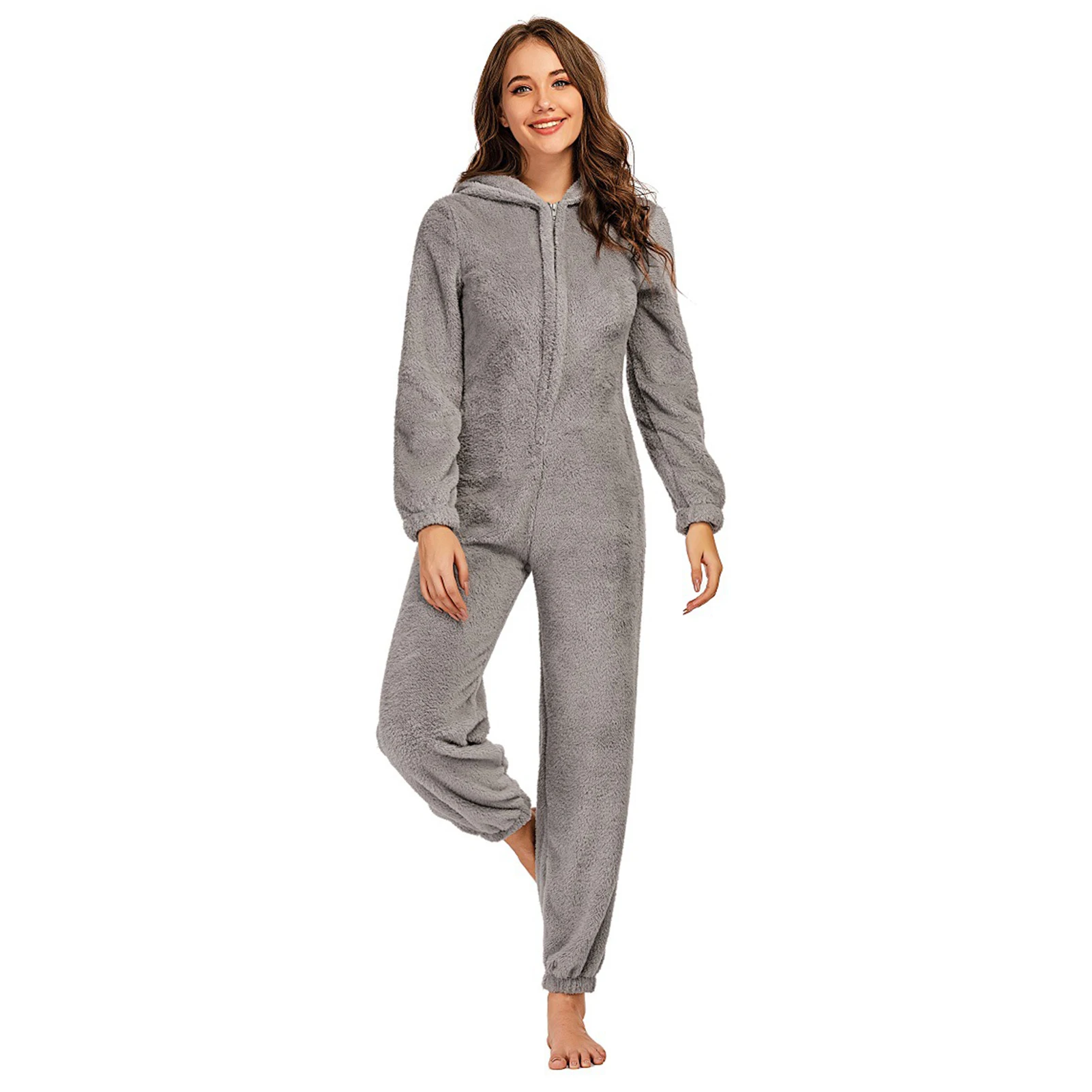 Женский зимний Плюшевый комбинезон, пижама с длинным рукавом на молнии с капюшоном, толстый теплый комбинезон