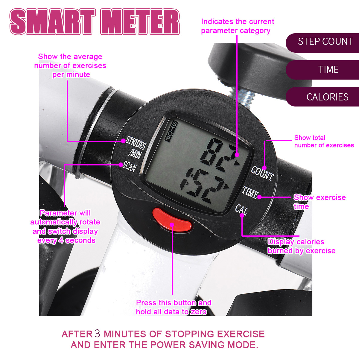 -Умный счетчик, который легко измеряет калории, записывает количество упражнений и сожженных калорий, экран автоматически отключается через 3 минуты остановки упражнений и войдет в режим энергосбережения.