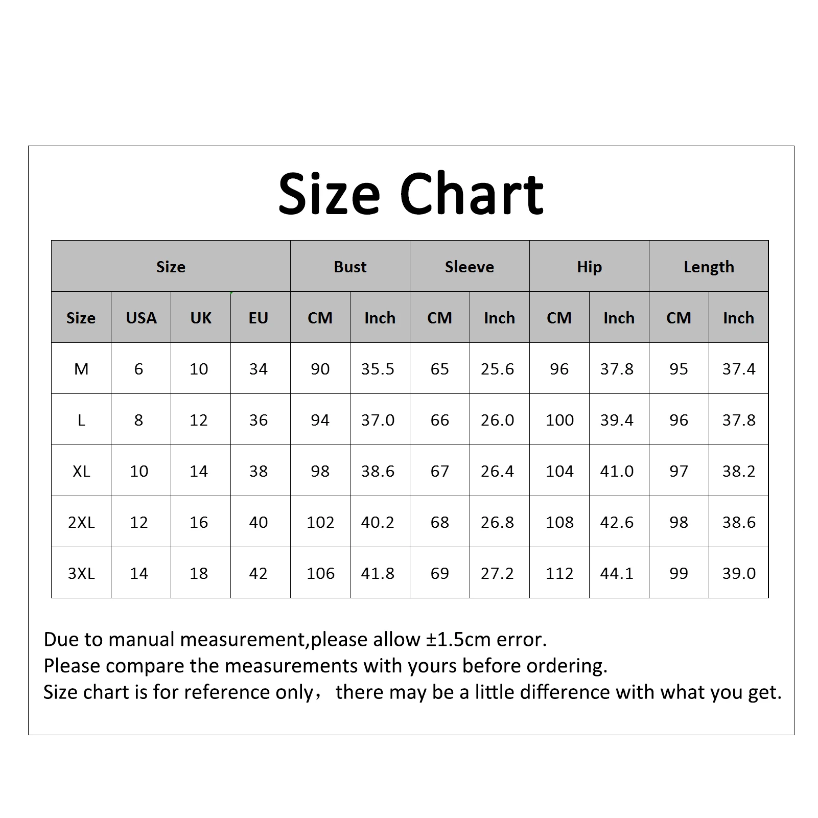 [Наш Размер 3XL] Обхват груди: 106 см/41,7 дюйма, обхват бедер: 112 см/44,1 дюйма, длина рукава: 70 см/27,6 дюйма, длина: 99 см/39 дюйма (приблизительно)