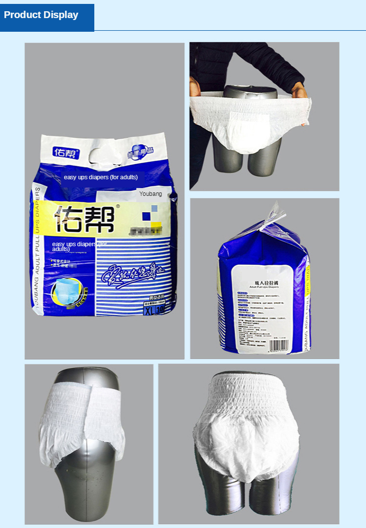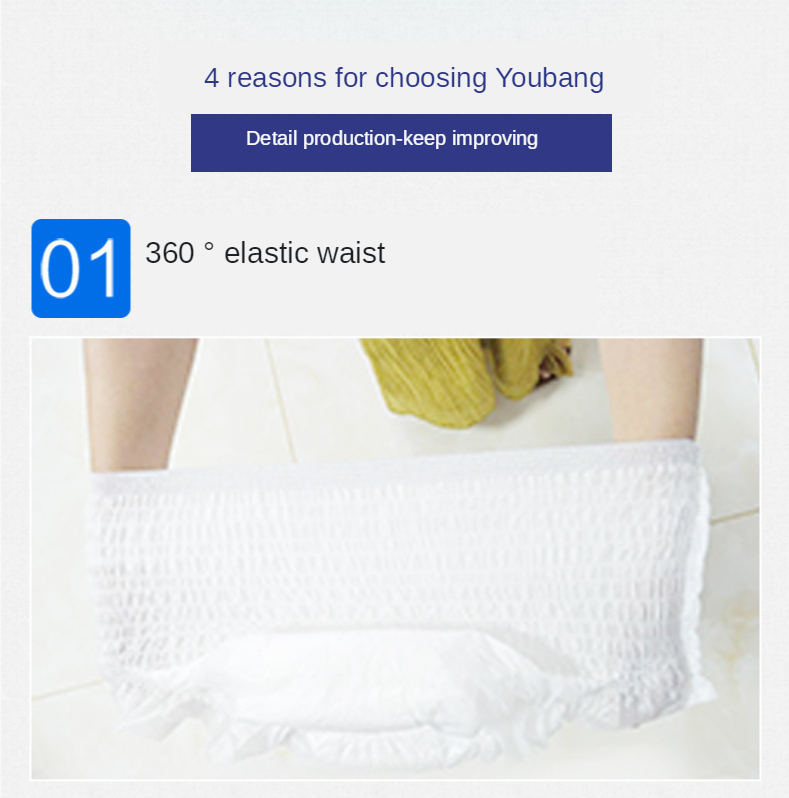 Основные характеристики: 1. Белая PE пластиковая Водонепроницаемая подкладка 2. Мягкий поверхностный слой, тканевая задняя панель, комфортные ощущения от руки 3. Супер Поглощение, Блокировка воды, сохраняет кожу сухой 4. Тип брюк, легко надевать и снимать 5. Принимает полимерные абсорбирующие и пушистые целлюлозы; Водопоглощающая структура, с сильной поглощающей способностью! 6. Он может много раз поглощать мочу и другие жидкости для тела, чтобы сохранить поверхность меняющейся подкладки сухой. 7. Быстро впитывает фекалии и удаляет неприятные запахи для обеспечения свежего воздуха в помещении. 8. Простота в использовании, охрана окружающей среды и санитария.