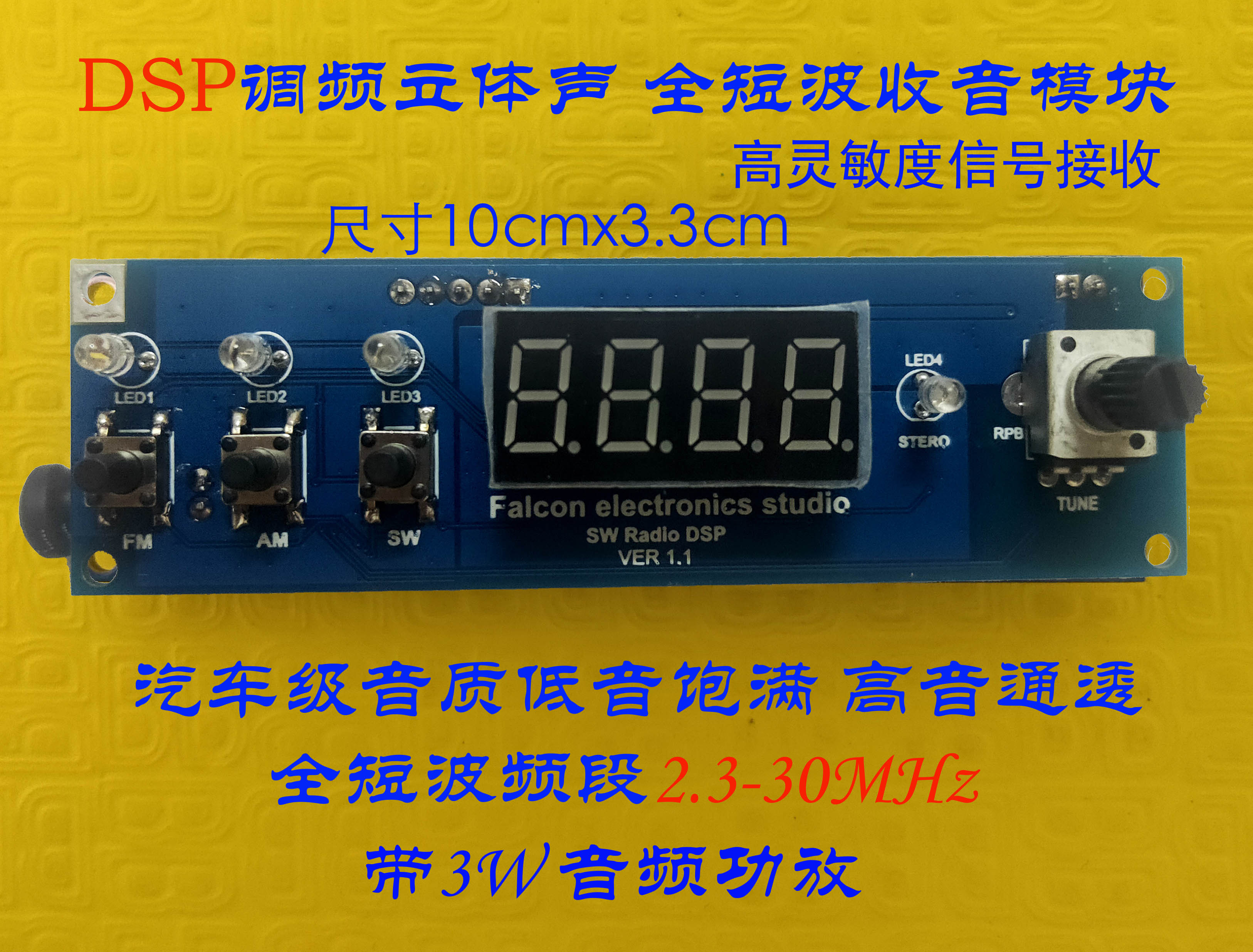 Модуль специально для автомобилейDSPРадиомикросхема, FMКачество звука круглое и насыщенное, и басы падают,Четкие высокие частоты, четкая последовательность, YesCDThe ощущение качества звука.FMFrequency браслета поддерживает кампус broadcasting64-87MHzAnd гражданского aviation118-135MHz 。 HF полный диапазон support2.6-30 МГц, DSPЧеткий прием коротких волн,Не легко отклоняться от частоты и платформы. В модуле установлены четыре битСветодиодныйЦифровая трубка,Для отображения частоты каждого диапазона в реальном времени, компактный и удобный, даDIYИдеальный модуль для высококлассных радиостанций,Этот модульAMИспользуется I-образная антенная катушка220 мкГнИндуктивность какAMПростая антенна, пользователи могут Замена на магнитную антенну(220-420 мкГн), ОтправитьAM/SWЛучшая чувствительность приема сигнала полосы, легче закрывать.