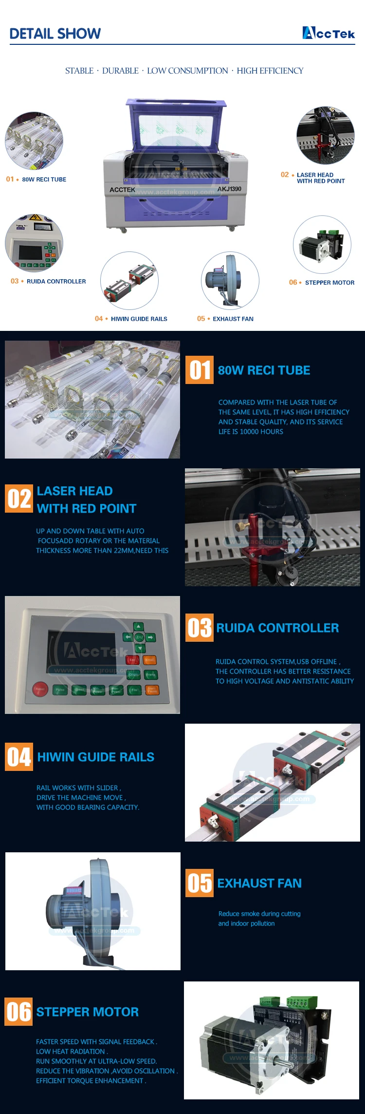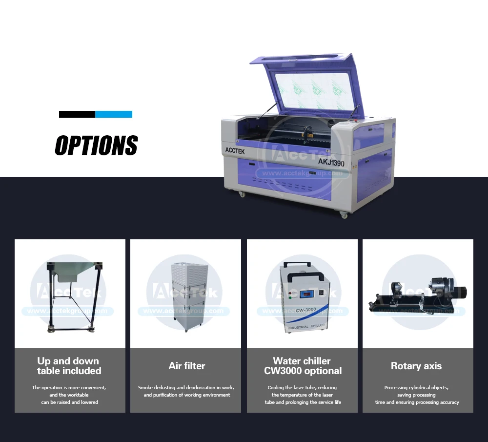 Стандартные конфигурации лазерного гравировального станка AKJ1390:# Размер рабочей зоны: 1300*900 мм