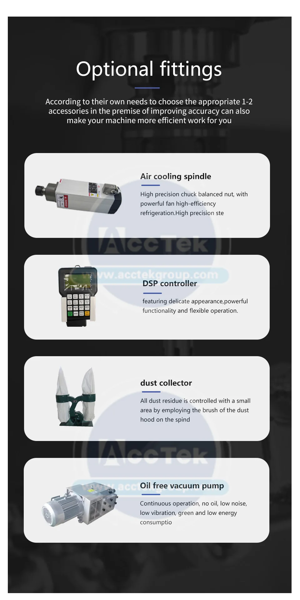 Наша основная продукция-станки с ЧПУ AccTek и лазерные гравировальные и режущие машины. Шток или пользовательские конфигурации-наша специализация. Компоненты для наших машин получены от поставщиков мирового класса и новаторов в управлении машиной.