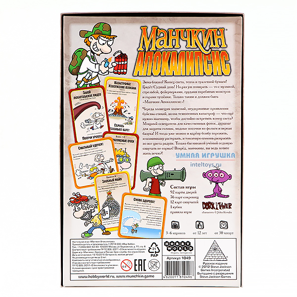 Манчкин Апокалипсис – это игра-катастрофа. Здесь даже трава плотоядна, а в морях обитают гиперразумные акулы. И в этом адском замесе вашему манчкину нужно не только выжить, но еще и «прокачаться» до 10-го уровня! Как видите, правила остались неизменными. Как и потрясающий дизайн и ироничный юмор. Насладитесь последними мгновениями существования этого мира!