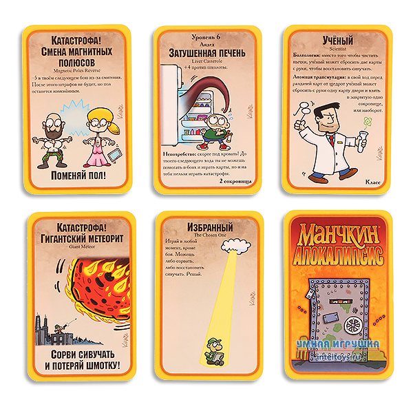 Главная особенность «Манчкин Апокалипсис» – это карты сивучатей, которые добавляют еще больше жара. Они имеют квадратную форму и лежат в отдельной колоде, а срывать их нужно тогда, когда этого требует другая карта или какое-то событие. Каждая сорванная сивучать влияет на вас и, возможно, на других игроков (в зависимости от того, что на ней написано). Но остерегайтесь 7-й сивучати: если ее открыть, наступит конец света и игра закончится. Победителем станет игрок, у которого больше всего бонусов и шмоток – уровни не в счет!