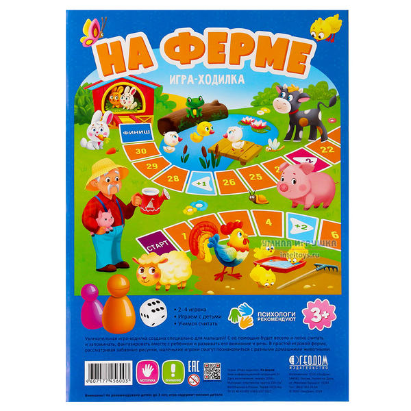 Ходилка На ферме – отличная возможность для компании малышей погулять по сельским угодьям, рассмотреть домашних животных и птиц, научиться правильно считать.