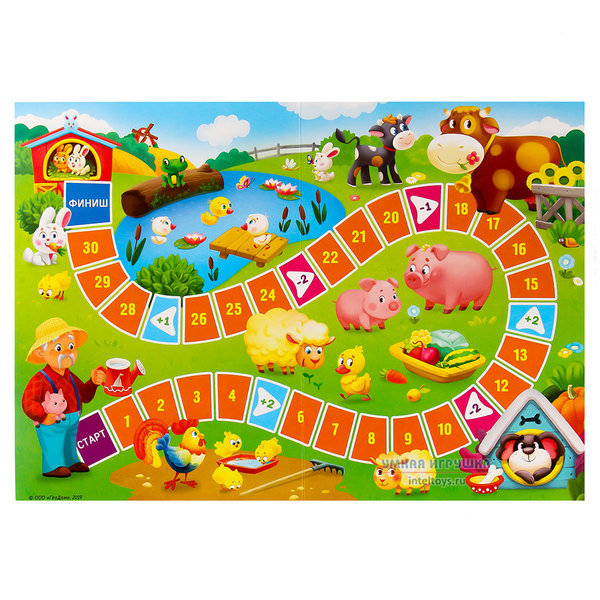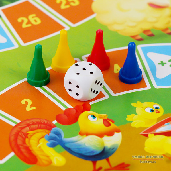 На старте 2-4 участников ждет заботливый хозяин. Отправляйтесь с ним по оранжевой дорожке! Количество шагов указывает кубик. Пусть ребята описывают все, что видят вокруг. Вот цыплята собирают зернышки с земли, барашек щиплет свежую травку, корова и хрюшка гуляют со своими детенышами, утята плавают в пруду.