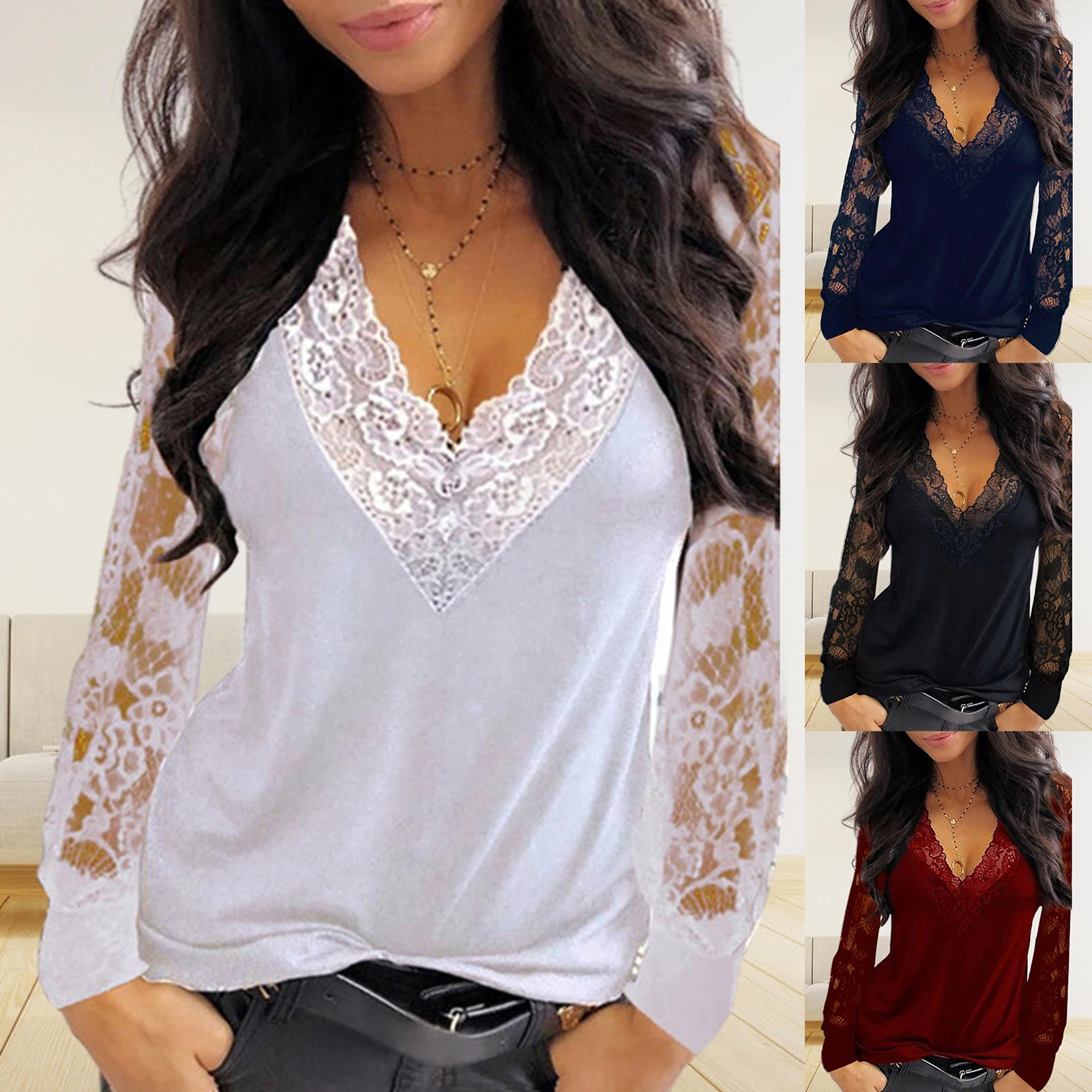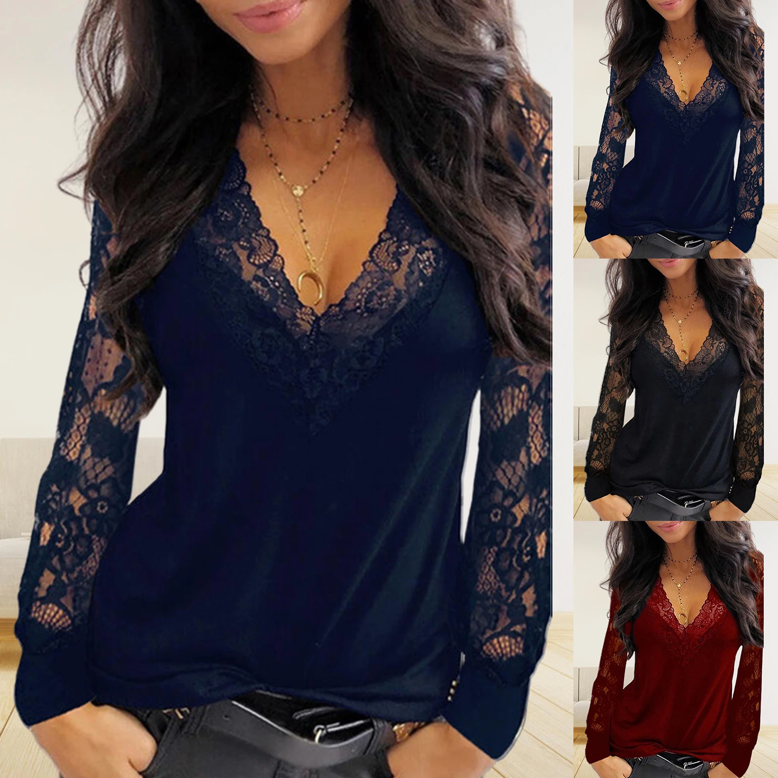 Сексуальный женский топ с глубоким v-образным вырезом и кружевной отделкой, Прозрачная Футболка с длинным рукавом