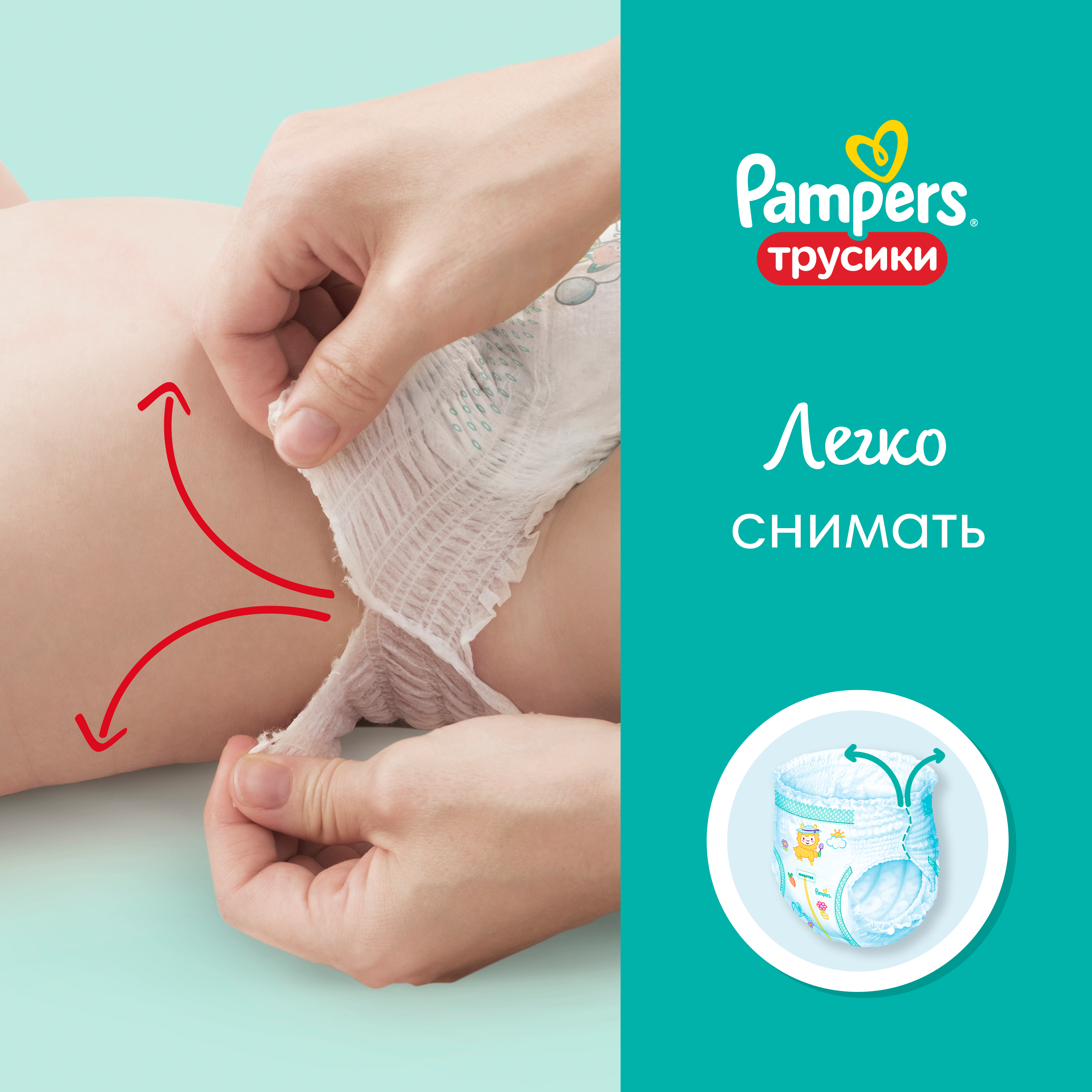 Трусики Pampers легко надевать и снимать, так что активные малыши смогут продолжать изучать мир вокруг, не отвлекаясь на смену трусиков! А когда трусики понадобится поменять, просто разорвите их по боковому шву!