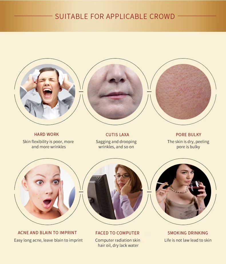 Исследования показывают, что он работает против узора глаз, мешков для глаз, вороньих лапок, линий экспрессии, складок, морщин и развития, обогащает argireline против старения, разглаживает морщины, улучшает провисание кожи, повышают эластичность кожи, сохраняют молодость.