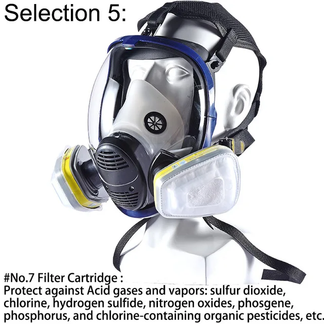 Выбор 5: • 1 маска для лица • 2 x # No.7 фильтрующий картридж • Хлопковые фильтры-2 шт. • 2 x крышка фильтра # No.7 функция картриджа: защита от кислотных газов и паров: диоксид серы, хлор, сероводород, оксиды азота, фосген, фосфор и хлорсодержащие органические пестициды и т. Д.