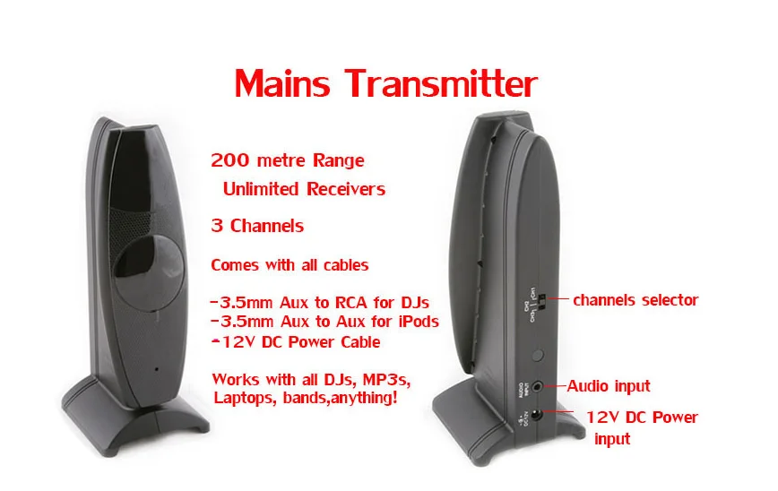 Источник питания наушников: 2AAA батареи Источник питания для передатчика: настенный адаптер DC12V * Складная конструкция для удобной переноски Как правило, 2 * AAA батареи могут работать около 20 часов непрерывной работы. * Довольно легко подключить. Подключите передатчик к тому, что вы хотите слушать (i.e iPod, DJ, Xbox, TV). См. Ниже инструкции по кнопкам: ![]() ![]() ![]() * Toally 2 канала,SНажмите кнопку питания, чтобы изменить каналы, с разделенной секундной автоматической настройкой.