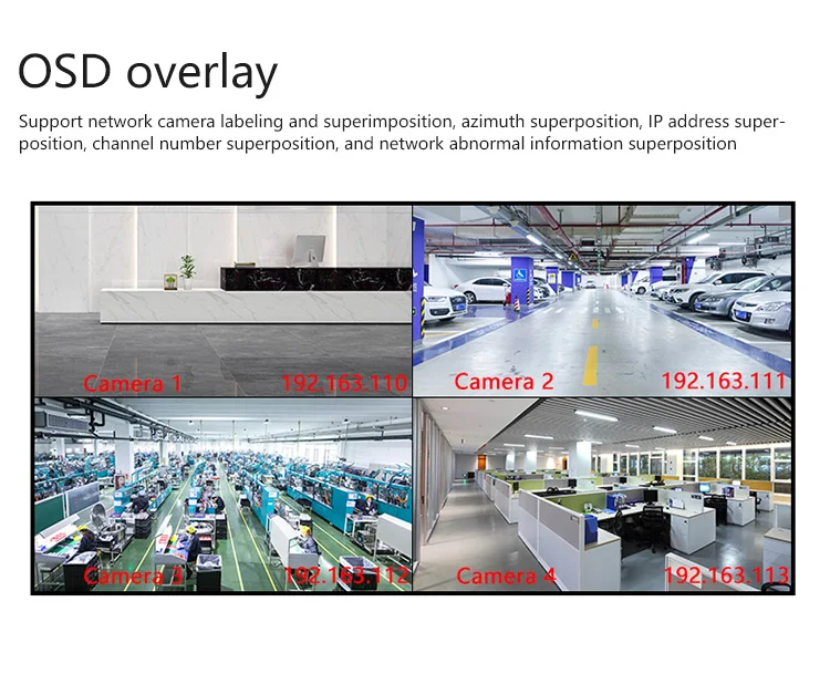E | Наложение OSD: Поддержка накладки этикеток сетевой камеры, наложения азимута, наложения ip-адреса, наложения номера канала и сетевого аномального наложения информации; |