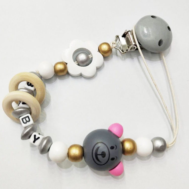 Baby Teether Toys Infant Boy Girl Flower Chain Pacifier Holder Safe Anti-Dropping Bear Cub Chew Wooden Toddler Pacifiers Clip