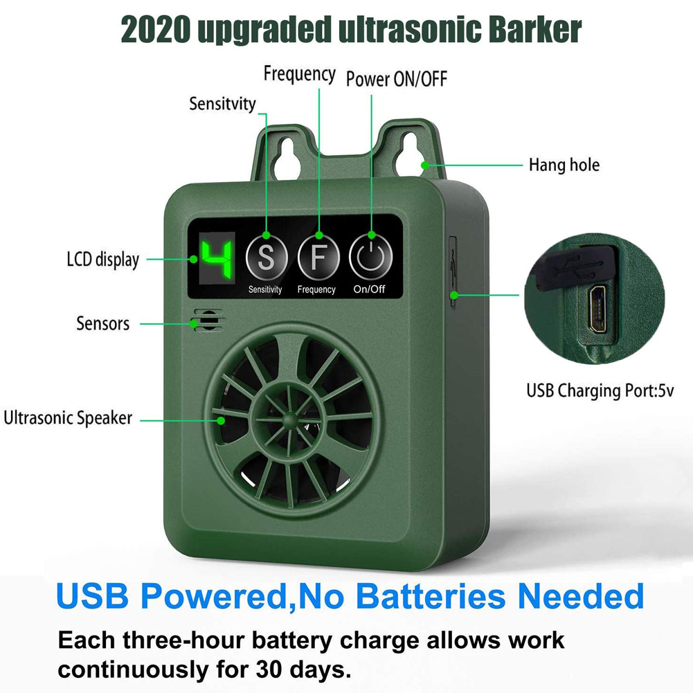 Bark-proof контроллер имеет тщательно разработанную мини-форму, которую можно повесить на деревья, внутри помещения, наружные стены или столбы забора, чтобы предотвратить лай любой собаки (в пределах диапазона), его можно безопасно использовать в помещении и на открытом воздухе в любых погодных условиях.