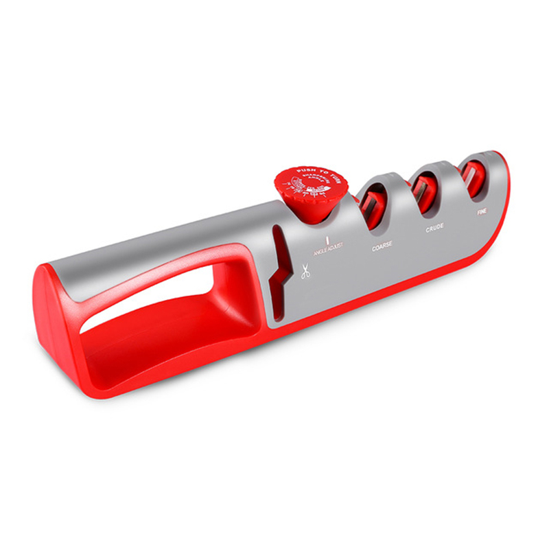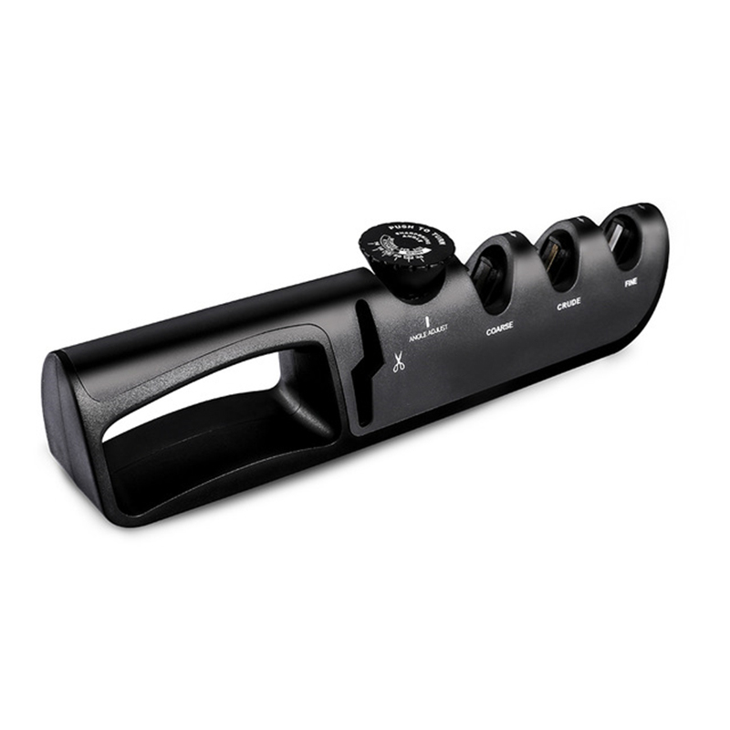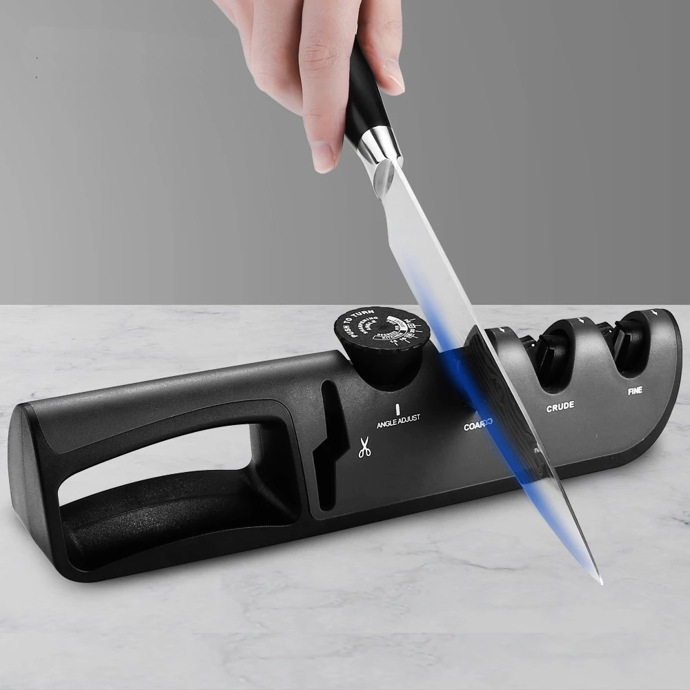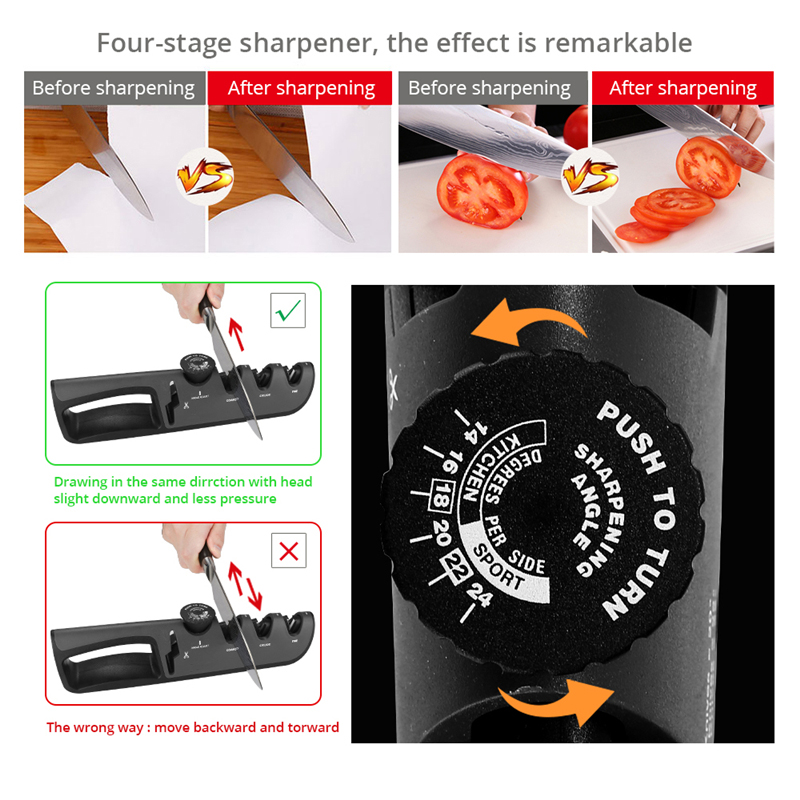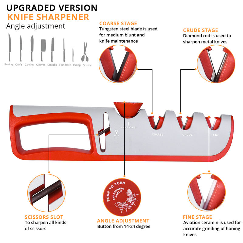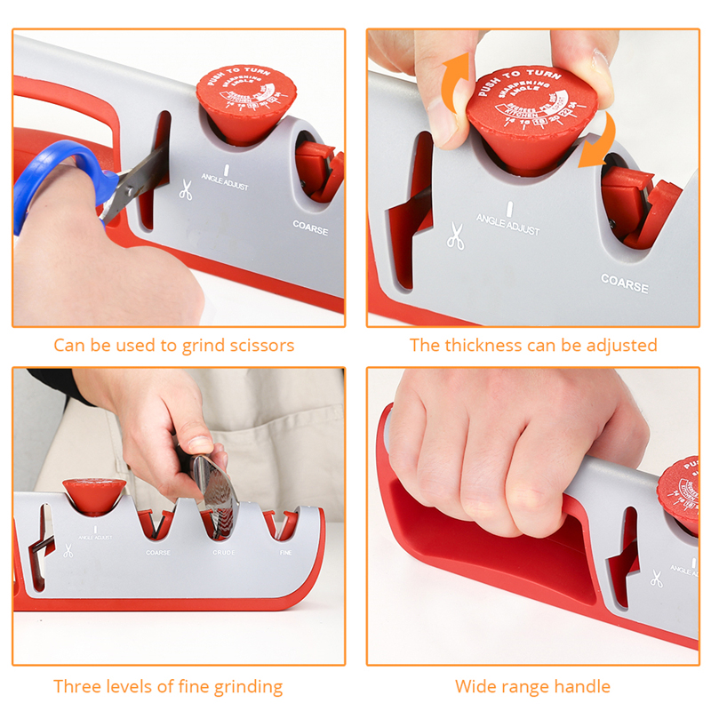 1. 4 в 1 точилка для кухонных ножей. В общей сложности 4 слота, бриллиант, вольфрам, керамика, слот для ножниц. Алмазный Слот Подходит для всех видов тупых лезвий; Подходит для точного шлифования всех видов режущих инструментов.