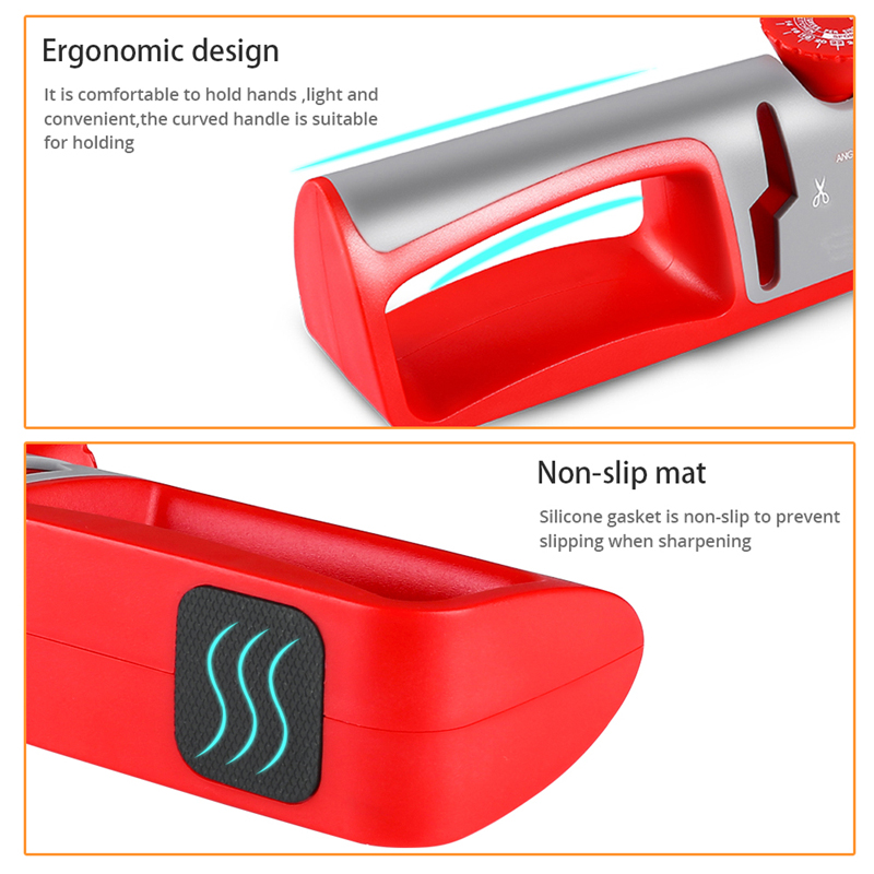 3. Прочный высококачественный материал. Модернизированная база из нержавеющей стали, эта острая машина для ножей имеет высококачественную квадратную базу из нержавеющей стали по сравнению с другими продуктами. Противоскользящая конструкция обеспечивает вам максимальное сцепление и повышает безопасность. С эргономичной ручкой из нержавеющей стали 430 и острым алмазом для сохранения остроты ножа, Заточка больше не является технической задачей. Кухонные ножи и ножницы легко доступны, экономя время и энергию