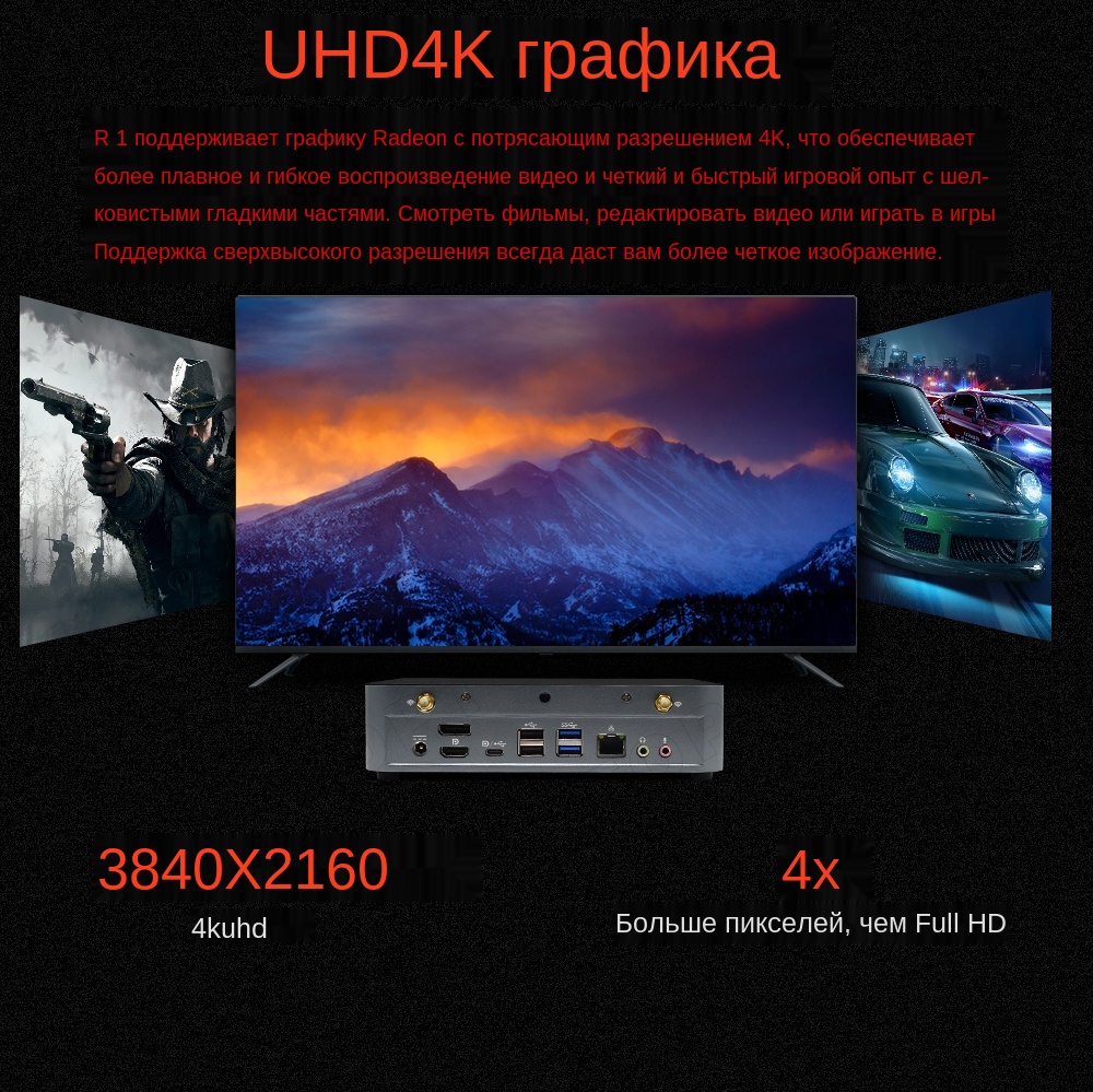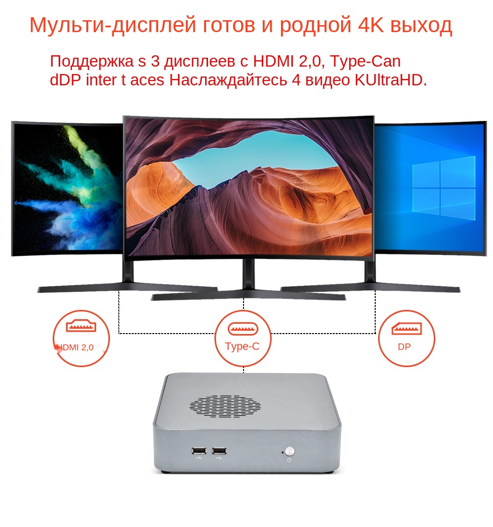 Видеопорты: 1 * HDMI 2,0, 1 * DP, 1 * Type-C, поддержка3x4K @ 60 ГцДисплей