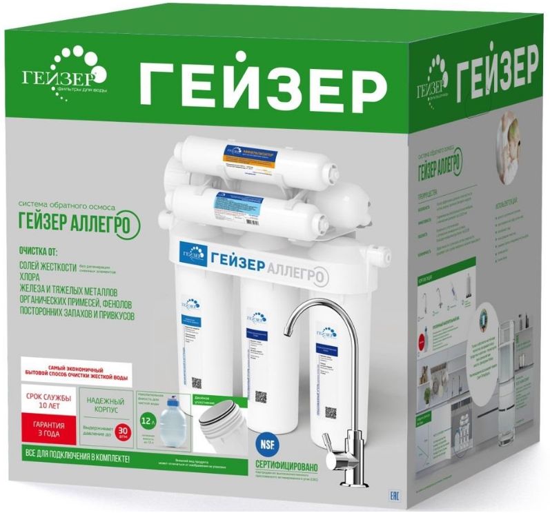 Гейзер-Аллегро используется для очистки водопроводной воды методом обратного осмоса, а это означает: