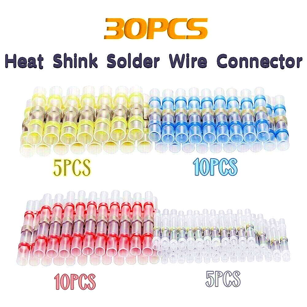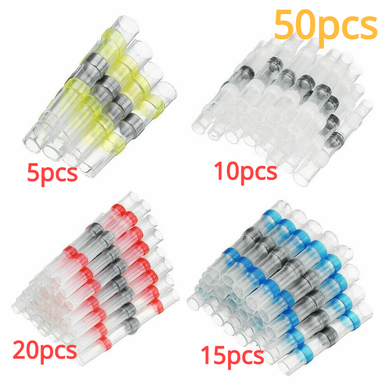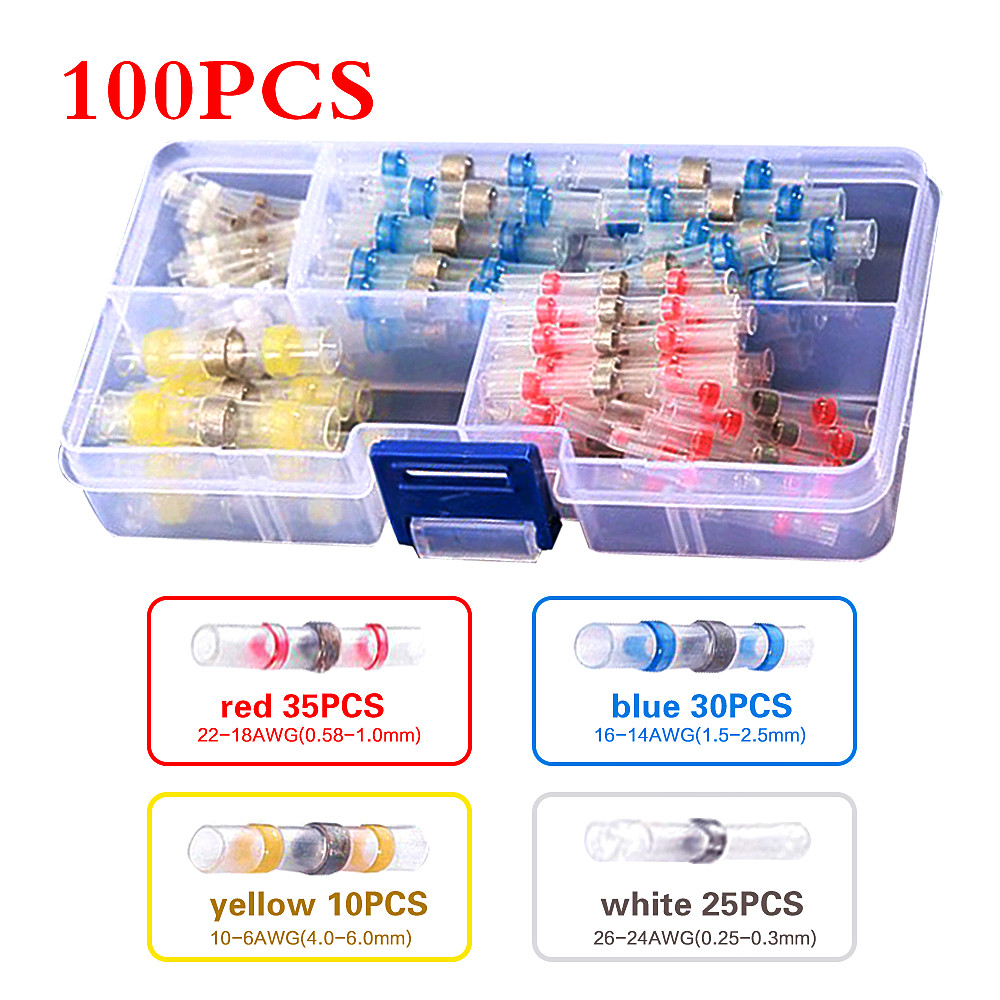 1.Included : 20/50/100pcs (Four Sizes:35xRed+30xBlue+25xWhite+10xYellow) heat shrink connectors