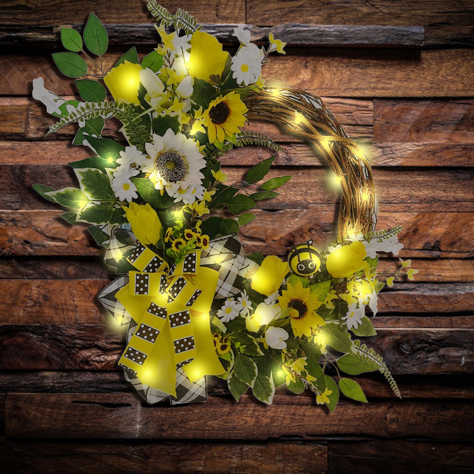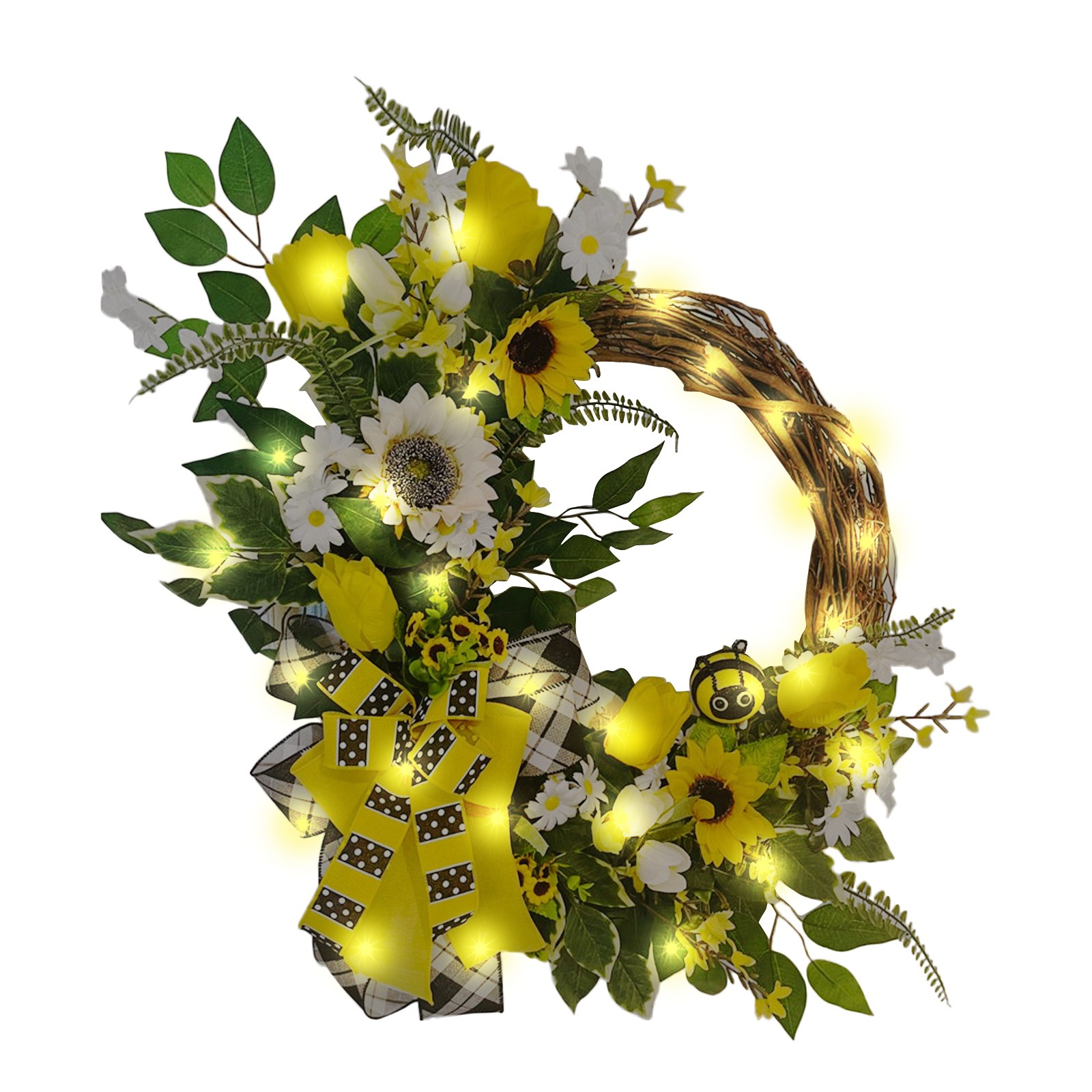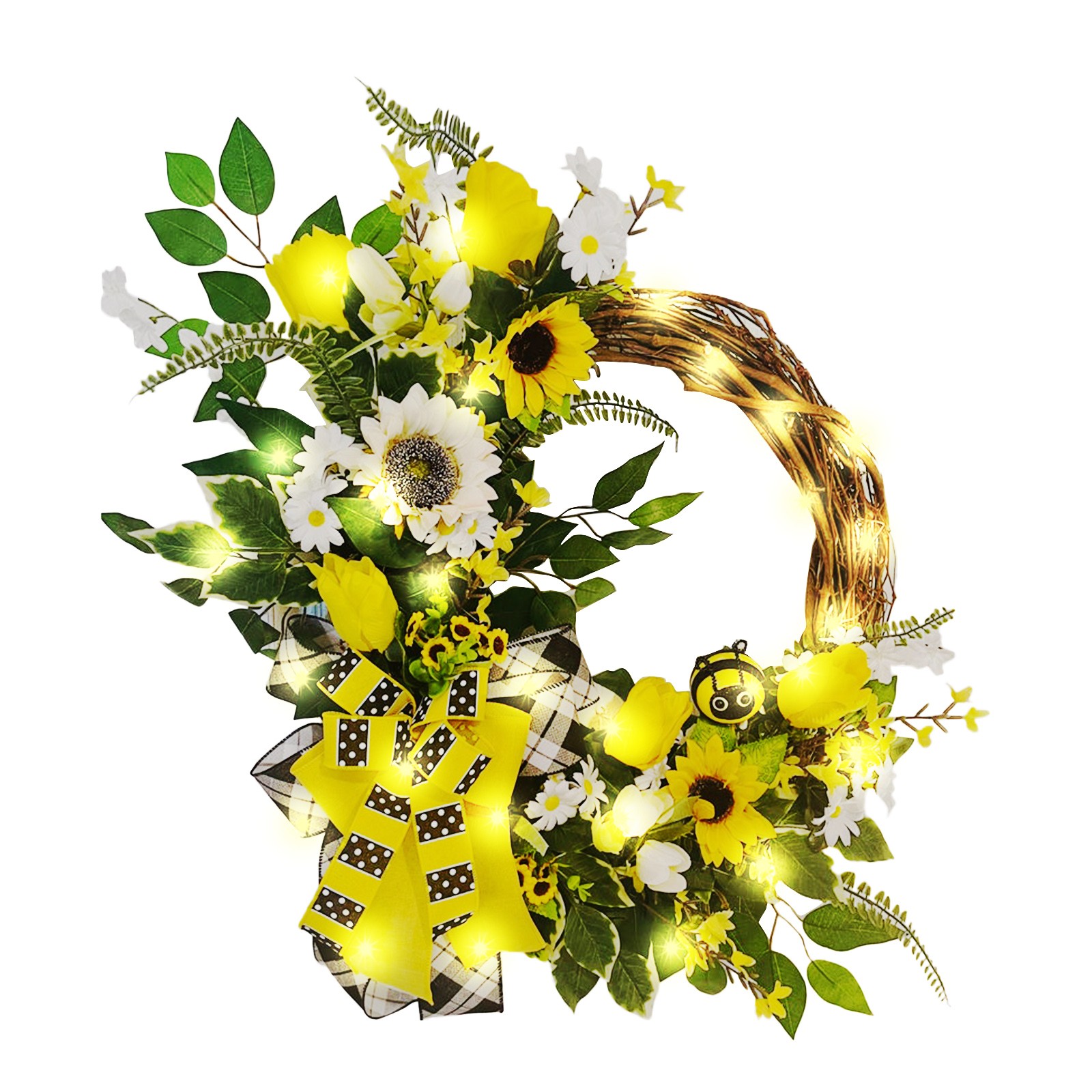 [Освещенный пчелиный венок из подсолнухов] прегорит 18 "x 22" дюймов пчелиный венок из подсолнухов, украшенный Пчелой, листьями бокса и шелковой гортензией, и джутовый бант, завязанный с одной стороны. Светящееся теплое белое светодиодное освещение. Принесите символ пасхи и весны для вашей входной двери.