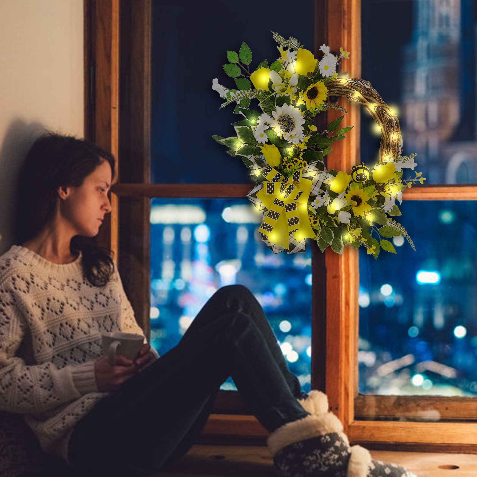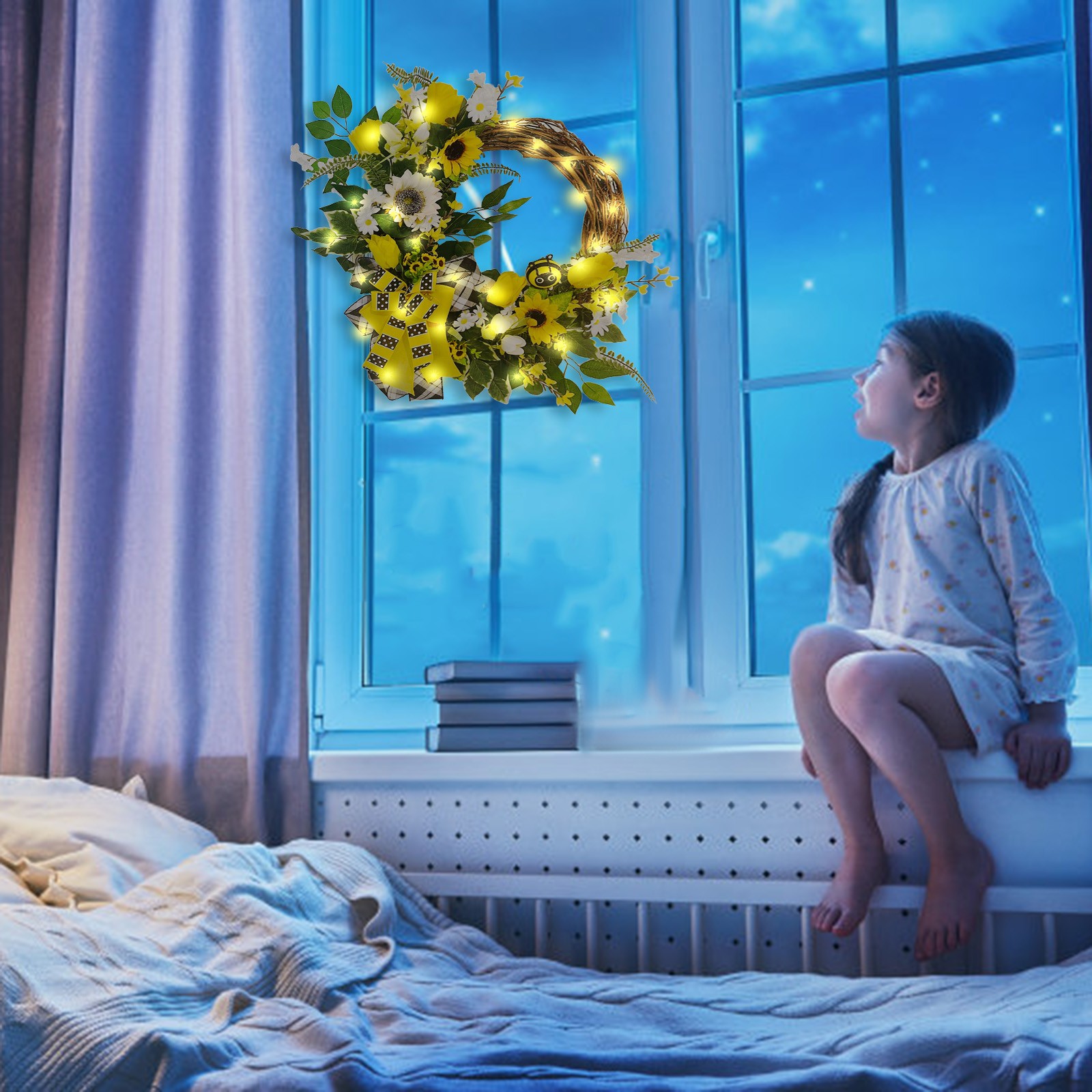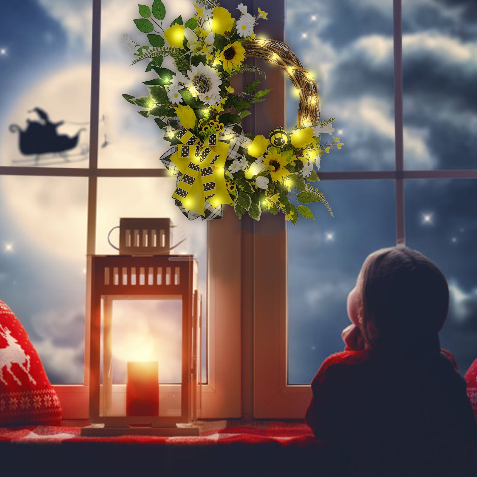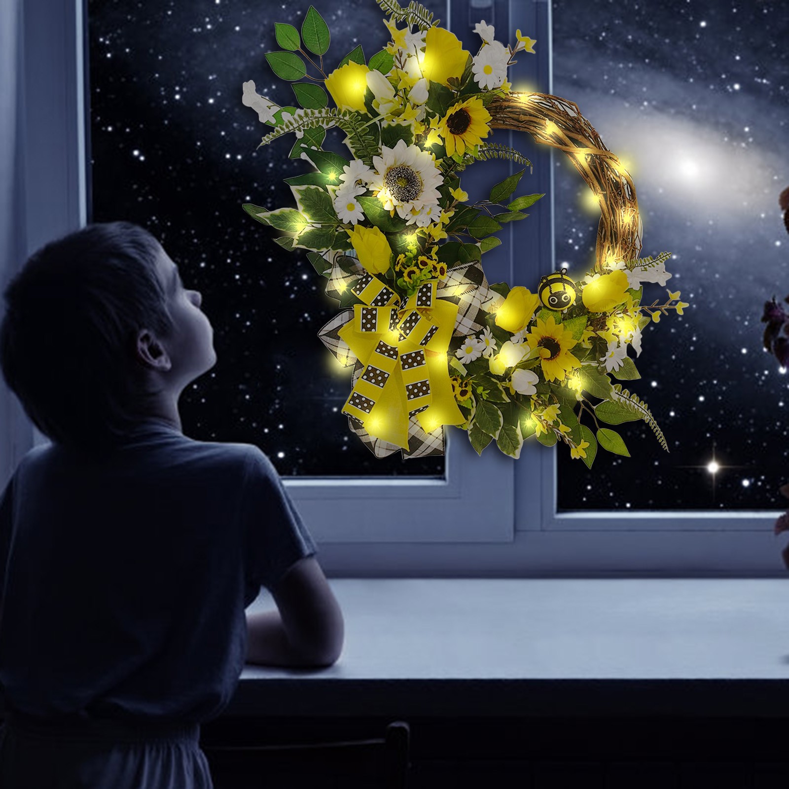 [Освещенный пчелиный венок из подсолнухов] прегорит 18 "x 22" дюймов пчелиный венок из подсолнухов, украшенный Пчелой, листьями бокса и шелковой гортензией, и джутовый бант, завязанный с одной стороны. Светящееся теплое белое светодиодное освещение. Принесите символ пасхи и весны для вашей входной двери.