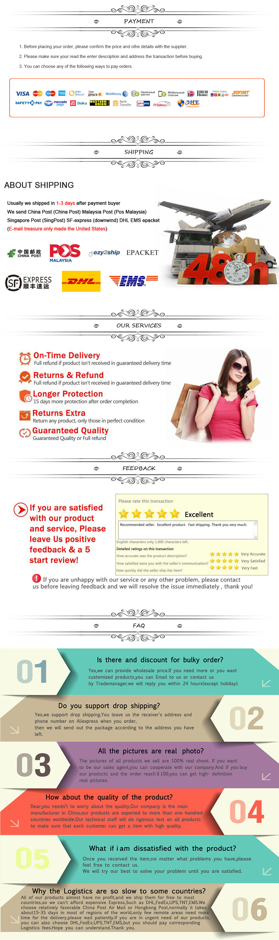 3. Мы стремимся предоставлять лучшее обслуживание и качество каждому клиенту. Отзывы очень важны для нас, если у товара есть какие-либо проблемы или вы не удовлетворены товаром, пожалуйста, свяжитесь со мной в любое время, тогда мы сможем сделать для вас лучше.