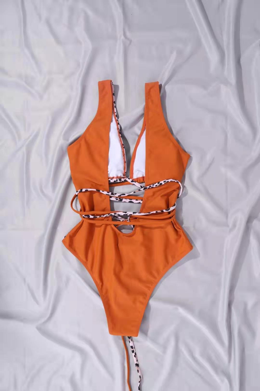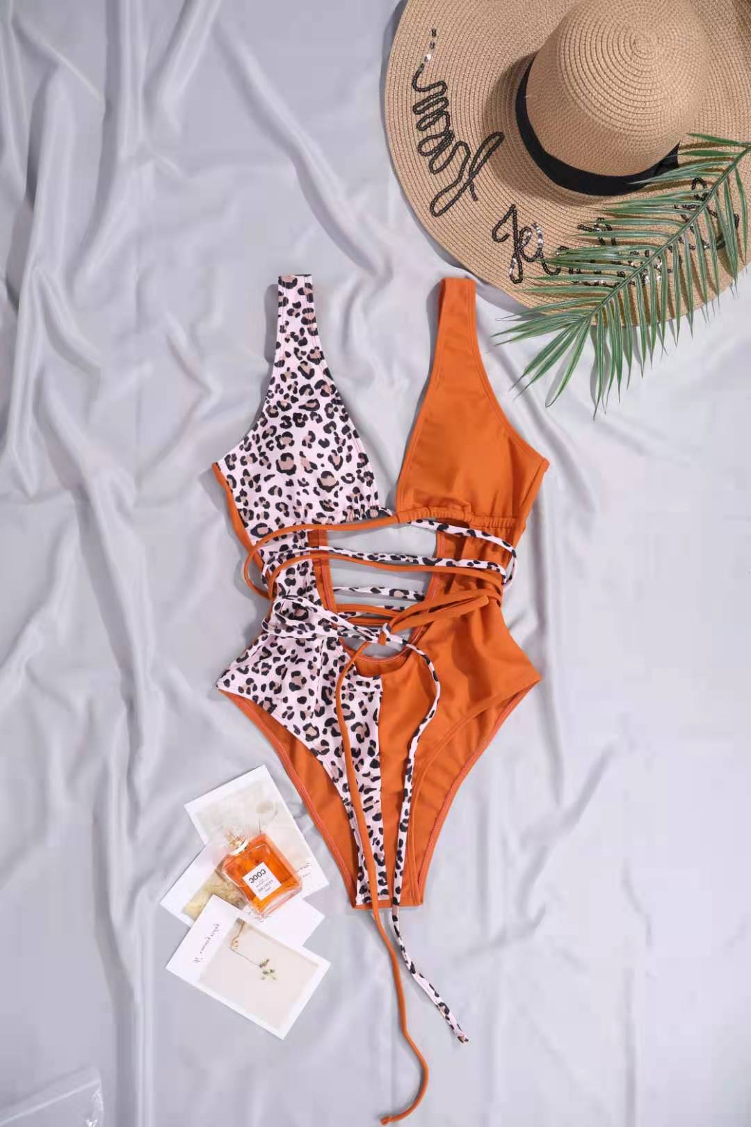 Женский сексуальный купальник с вырезами на шнуровке, монокини с цветными блоками, Леопардовый лоскутный купальник с открытой спиной