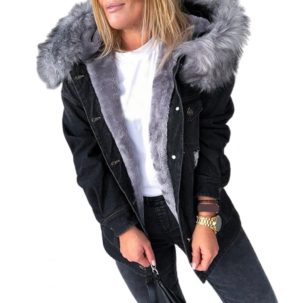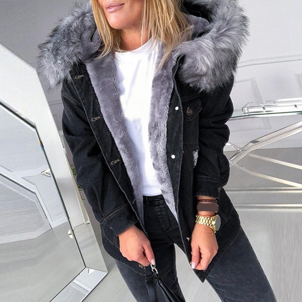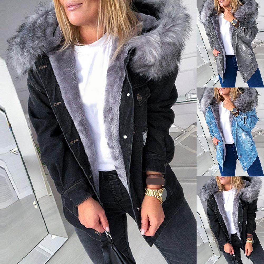 Зимняя женская теплая куртка с длинным рукавом и капюшоном из искусственного меха, рваная джинсовая куртка на пуговицах, женское джинсовое теплое пальто