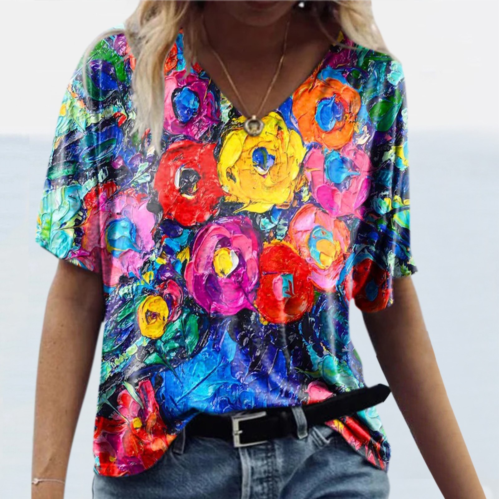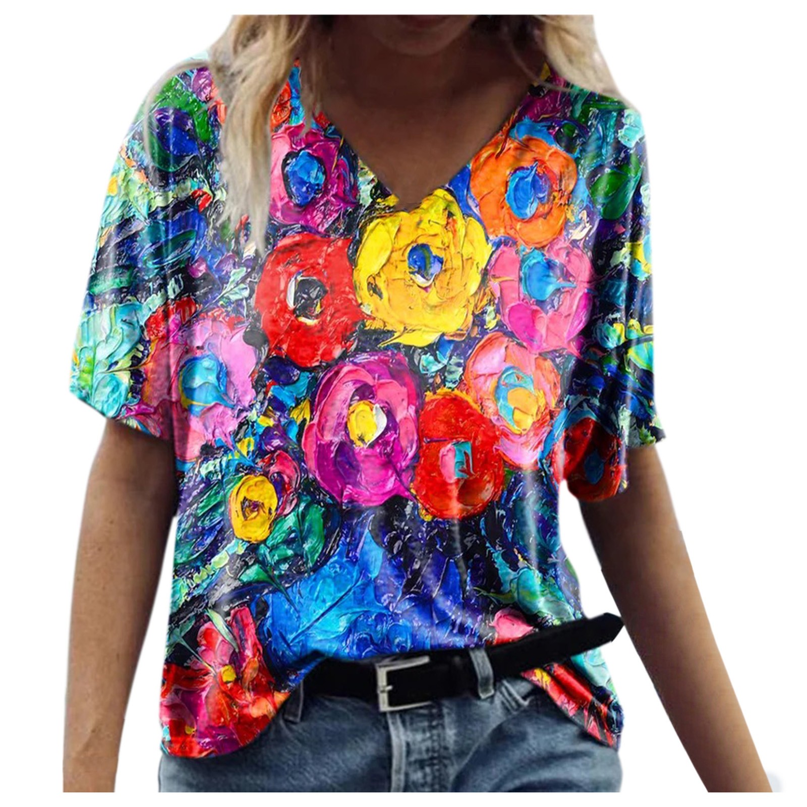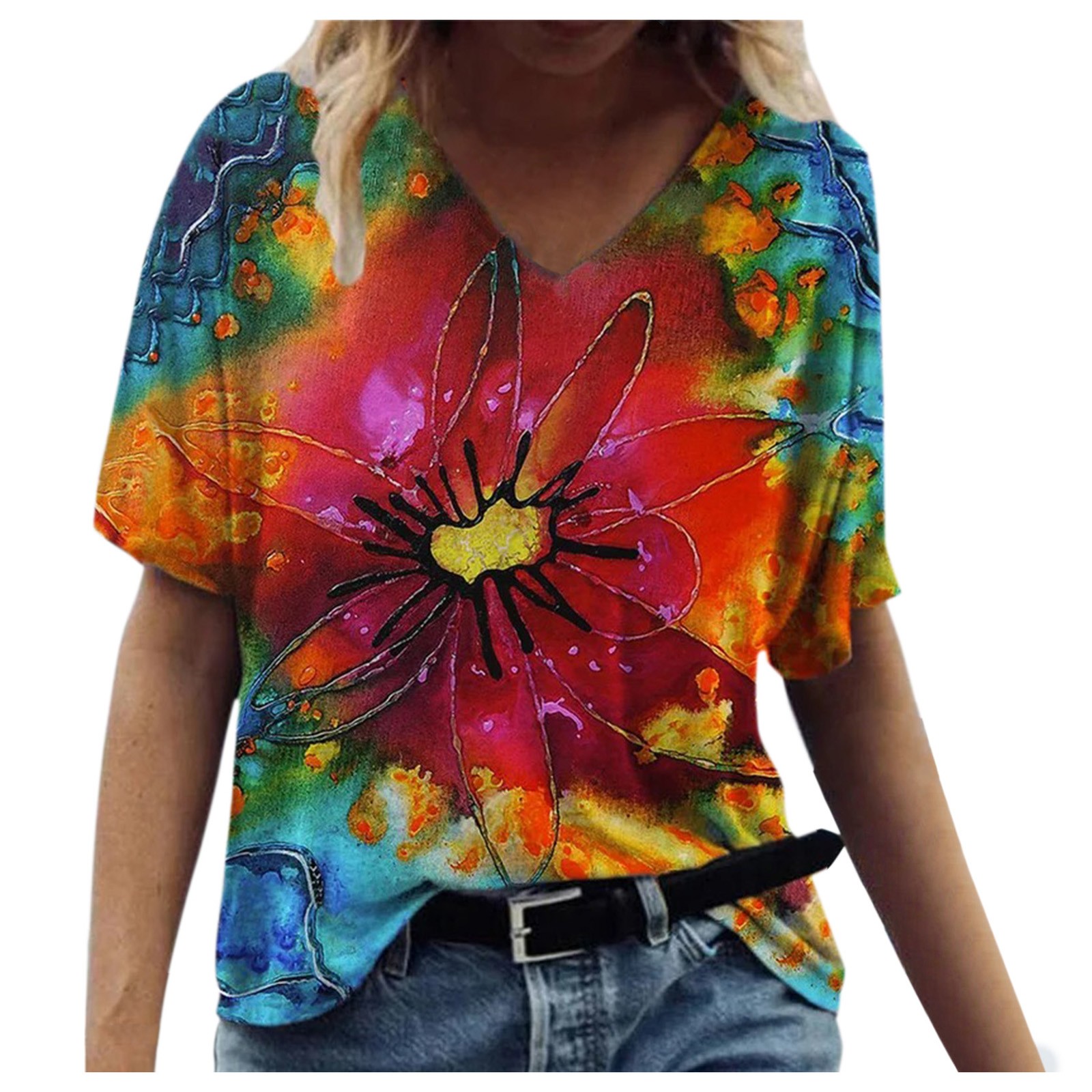 Женская футболка с короткими рукавами и v-образным вырезом с цветочным принтом