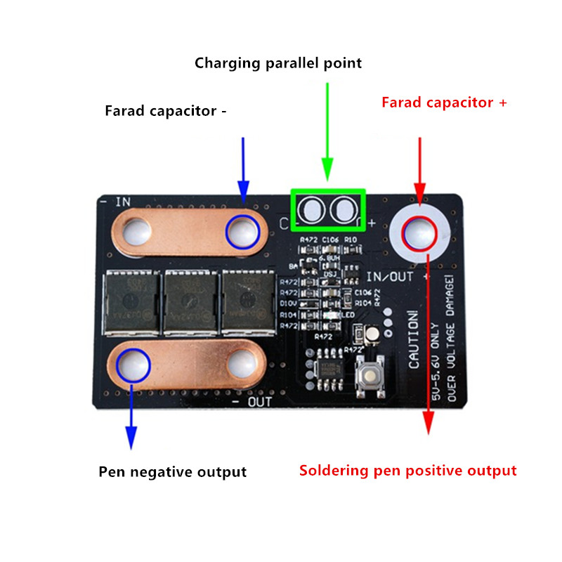 Этот продукт не содержит конденсаторы fara, и цепь не включает в себя контроль зарядки, поэтому клиенты должны решить проблему зарядки конденсатора самостоятельно. Данный товар подходит для подключения 2 серии farad, конденсаторы (2,8 V + 2,8 V). Рекомендуется использовать одну емкость 3000F или выше. Схема точно контролируется одночипной компьютерной программой. Он разделен на 3 уровня мощности. Он автоматически определяет контактное сопротивление припоя и автоматически срабатывает. 300A силовая трубка X4 выход параллельно сварки 0,15 никель штук кусочек торта, 0,2 у меня не пытались. Этот продукт является самым сильным в нашем магазине.