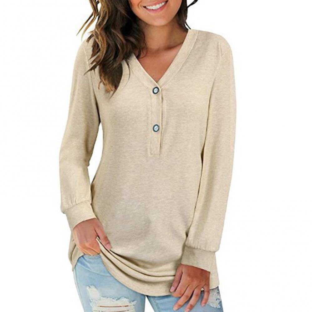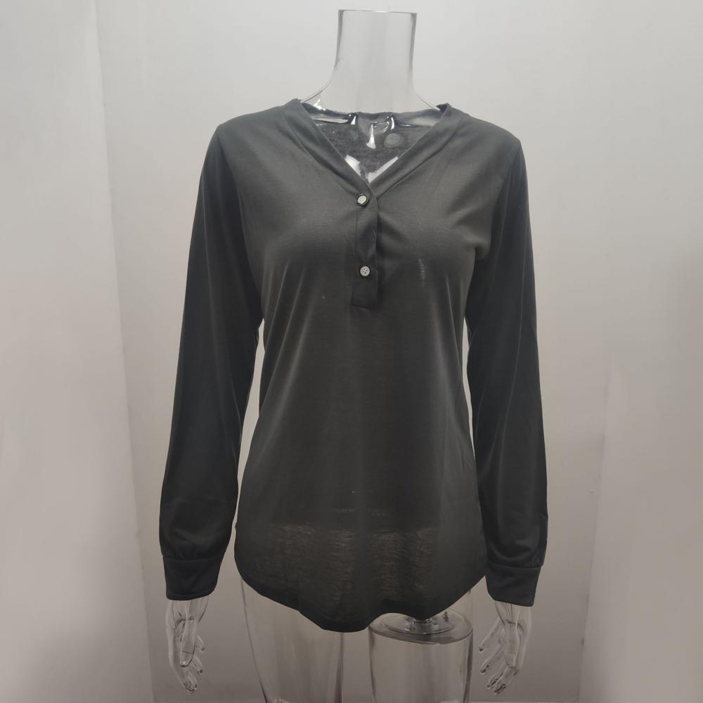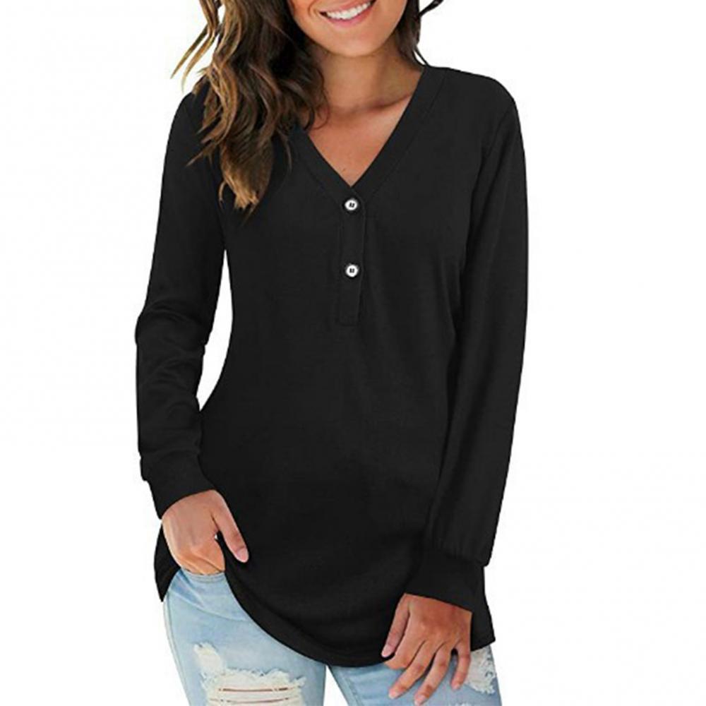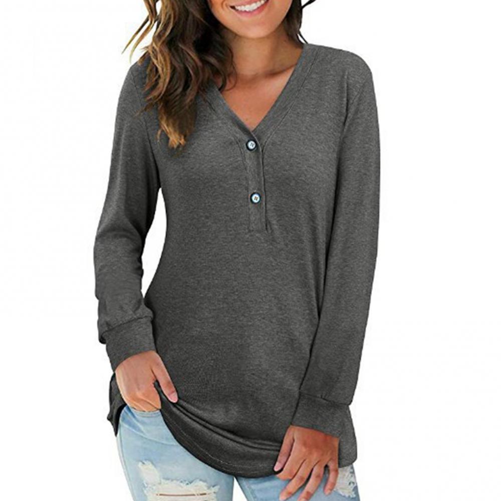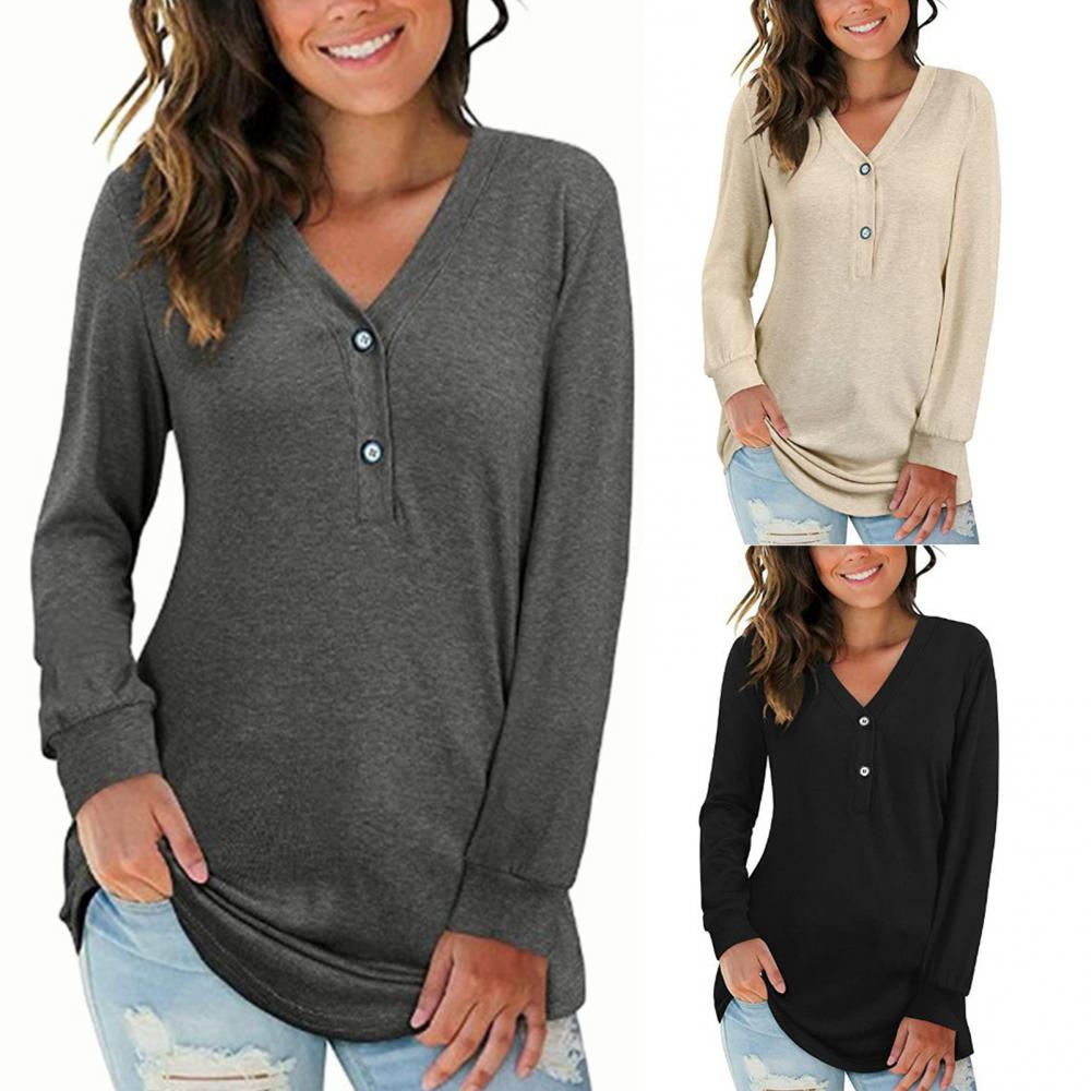 2021 модная женская однотонная блуза с v-образным вырезом, пуговицами и длинным рукавом, свободная футболка средней длины, повседневные свободные рубашки