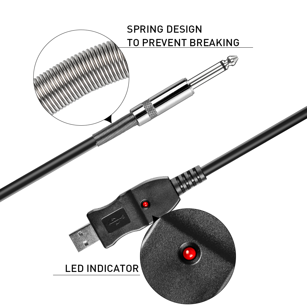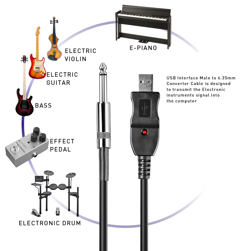 Используя кабель для подключения электрогитара с 6,35 мм интерфейс для того, чтобы там компьютер; Зарядка от USB plug and play, подходит для почти все виды компьютеров с USB портом для зарядки.