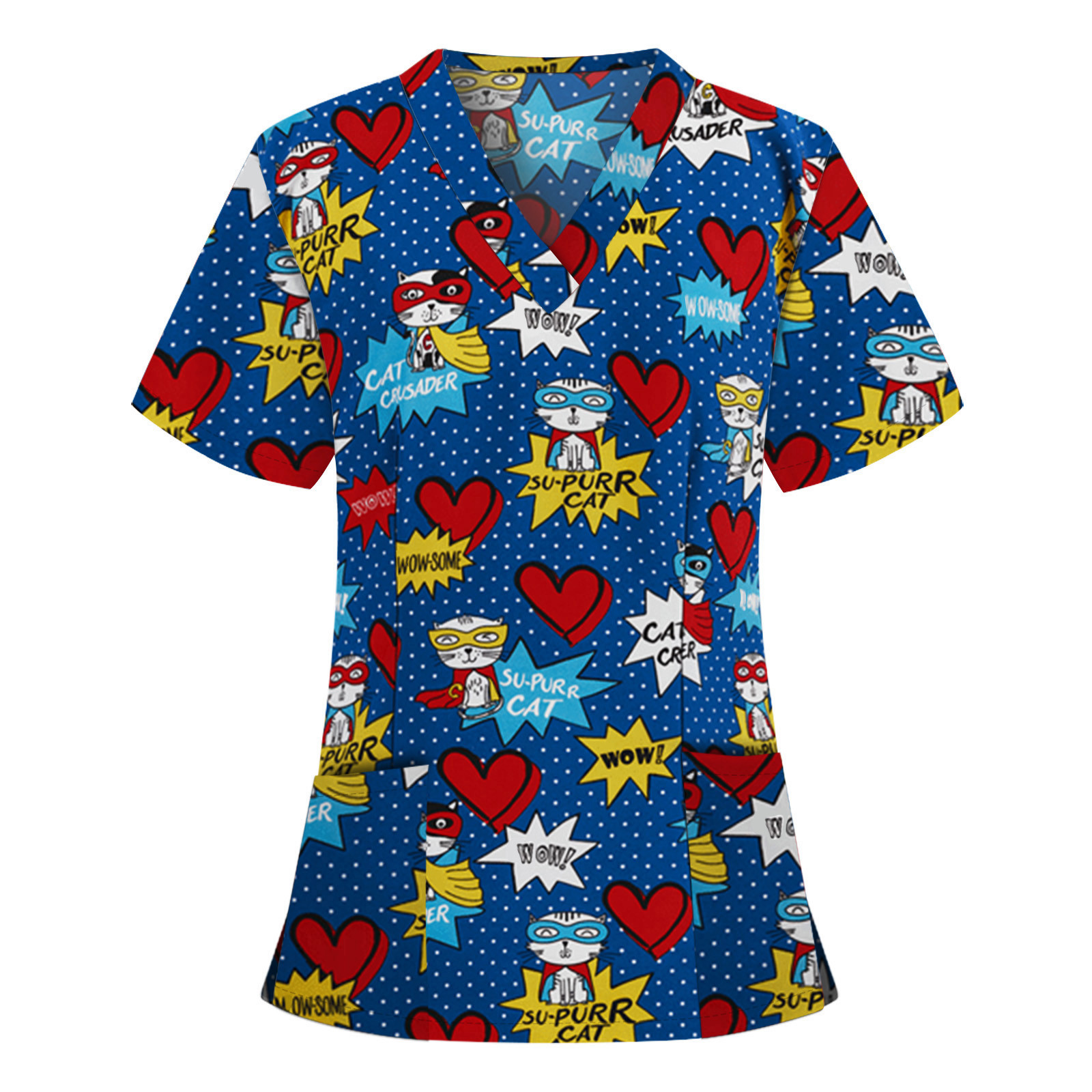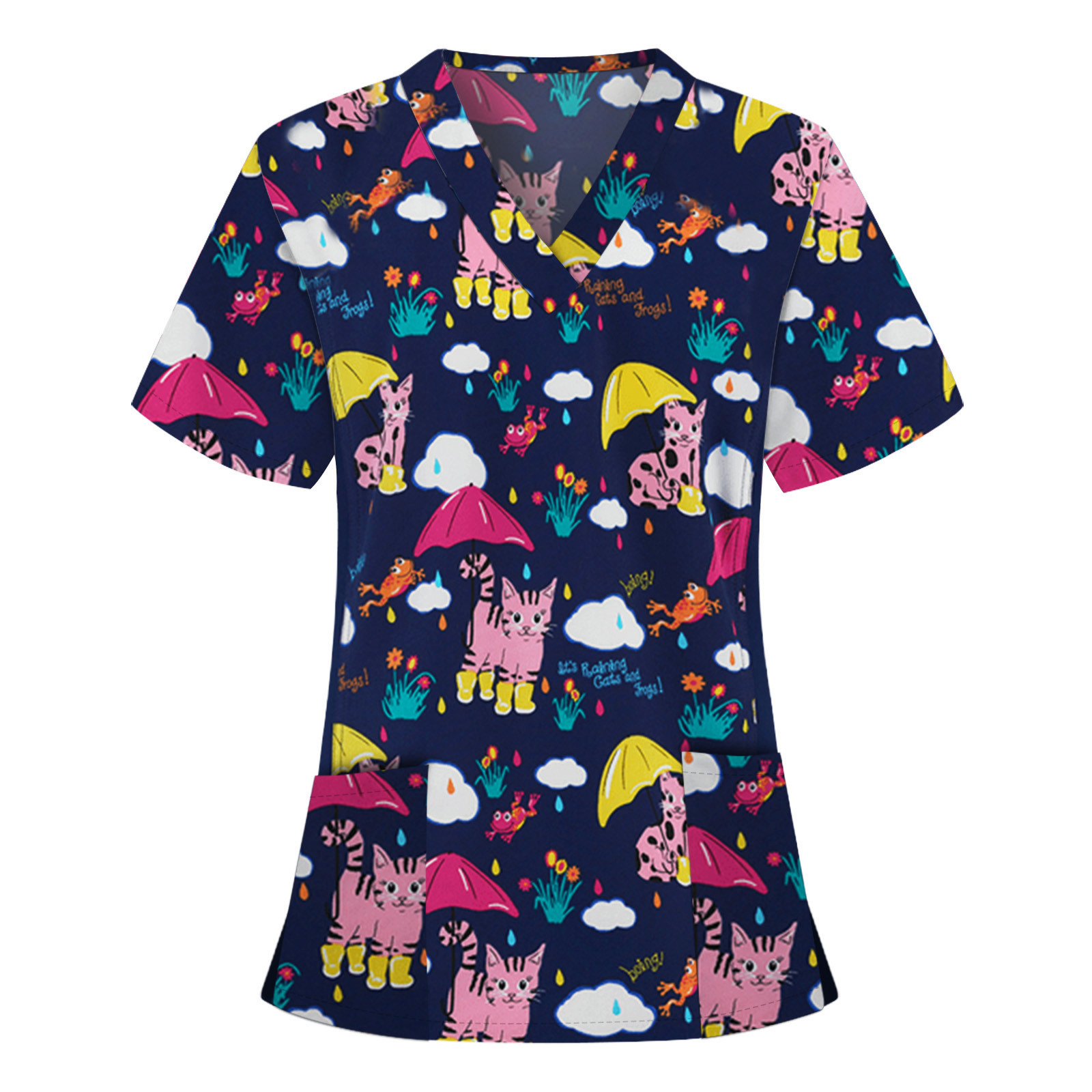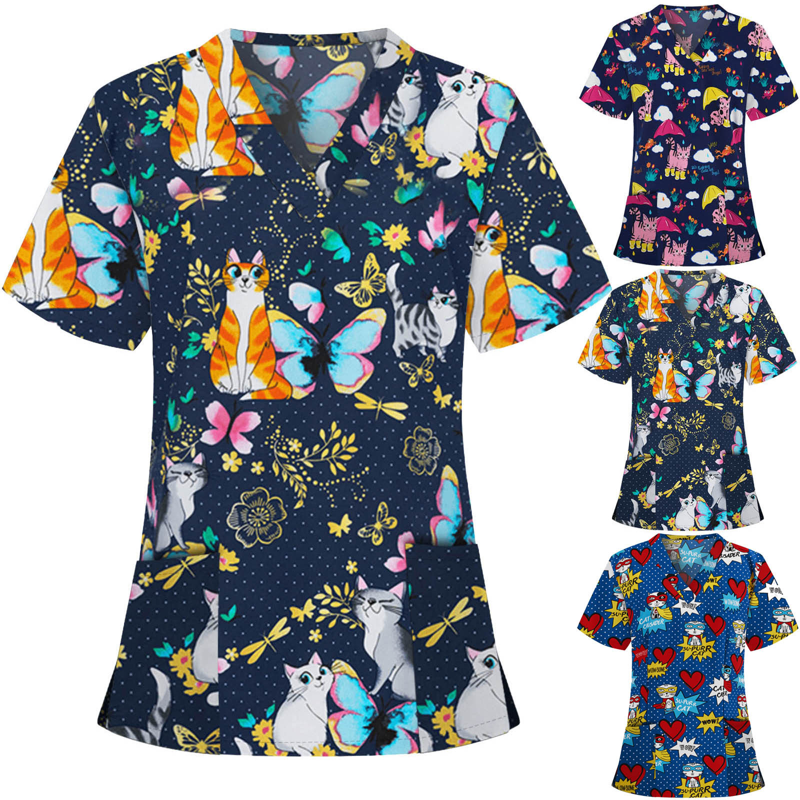 Милые женские топы с мультяшным принтом, женская футболка, повседневная женская форма с коротким рукавом, с v-образным вырезом и карманом A50