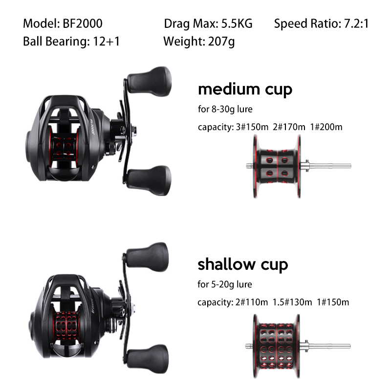 Модель: BF2000 ("чашка" среднего размера/проездка по чашки) Тип: катушка Baitcast Цвет: черный Шариковый подшипник: 12BB + 1RB Скорость передаточное число: 7,2: 1 Вес: 0,212 кг Посылка: 14*11*7 см Сопротивления Макс: 5,5 кг Ручка: левая/правая, не взаимозаменяемая Содержание: 1 Рыболовная катушка с 1 проволочная чашка в комплекте, вы можете выбрать "чашка" среднего размера или с постепенным увеличением чашки Механизм для модели, соотношение веса, объем чашки (мм/м) BF2000-MEDIUM-CUP 7,2: 1 8-30 г 3/150 2/170 1/200 BF2000-SHALLOW-CUP 7,2: 1 5-20 г 2/110 1,5/130 1/150