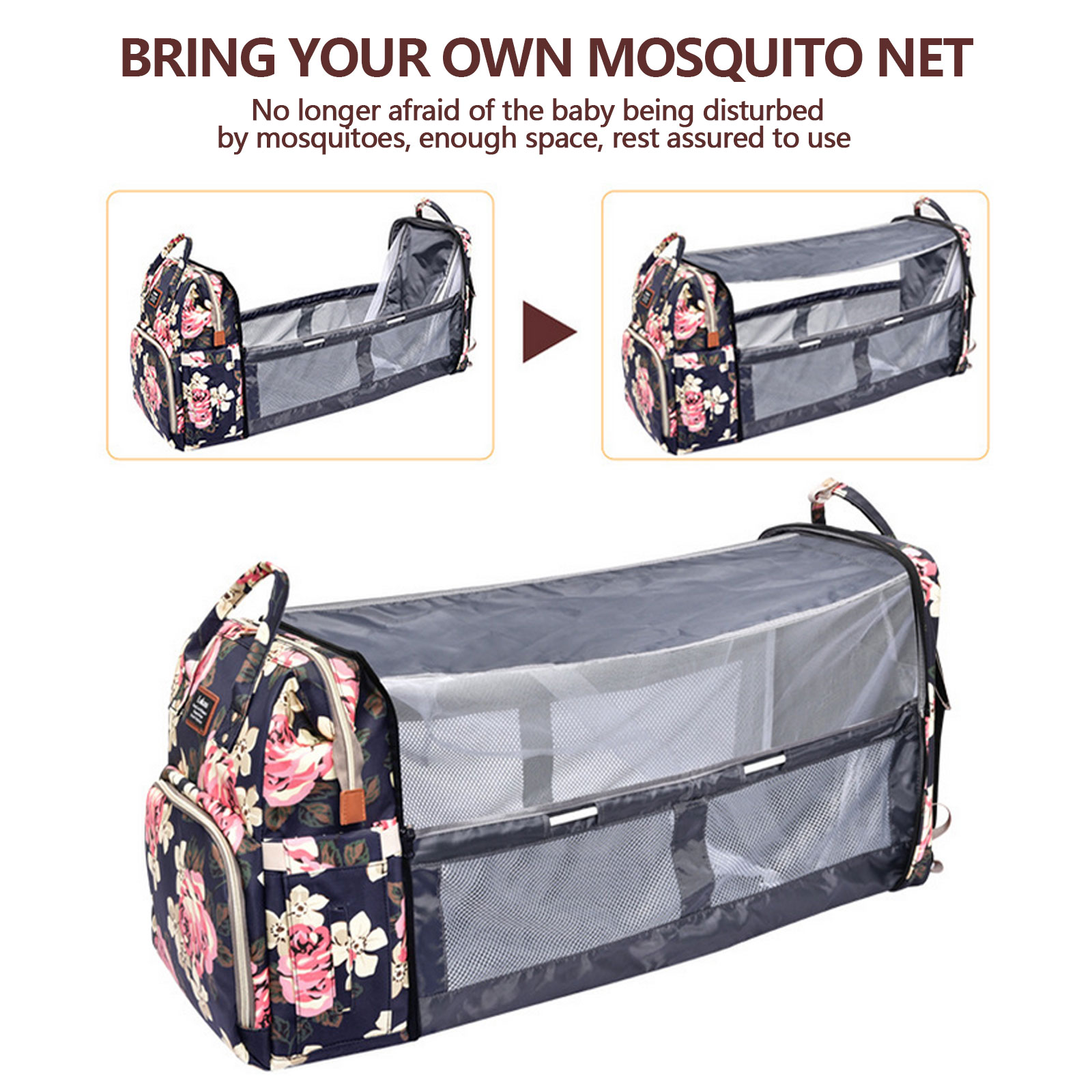 Подходит для использования на улице:Этот многофункциональный рюкзак очень подходит для прогулок. Его склад молока из алюминиевой фольги может держать молоко ребенка в тепле. Внешний usb-порт удобен для мамы для зарядки телефона. Со съемной москитной сеткой ребенок может спать более комфортно, не беспокоясь от комаров.