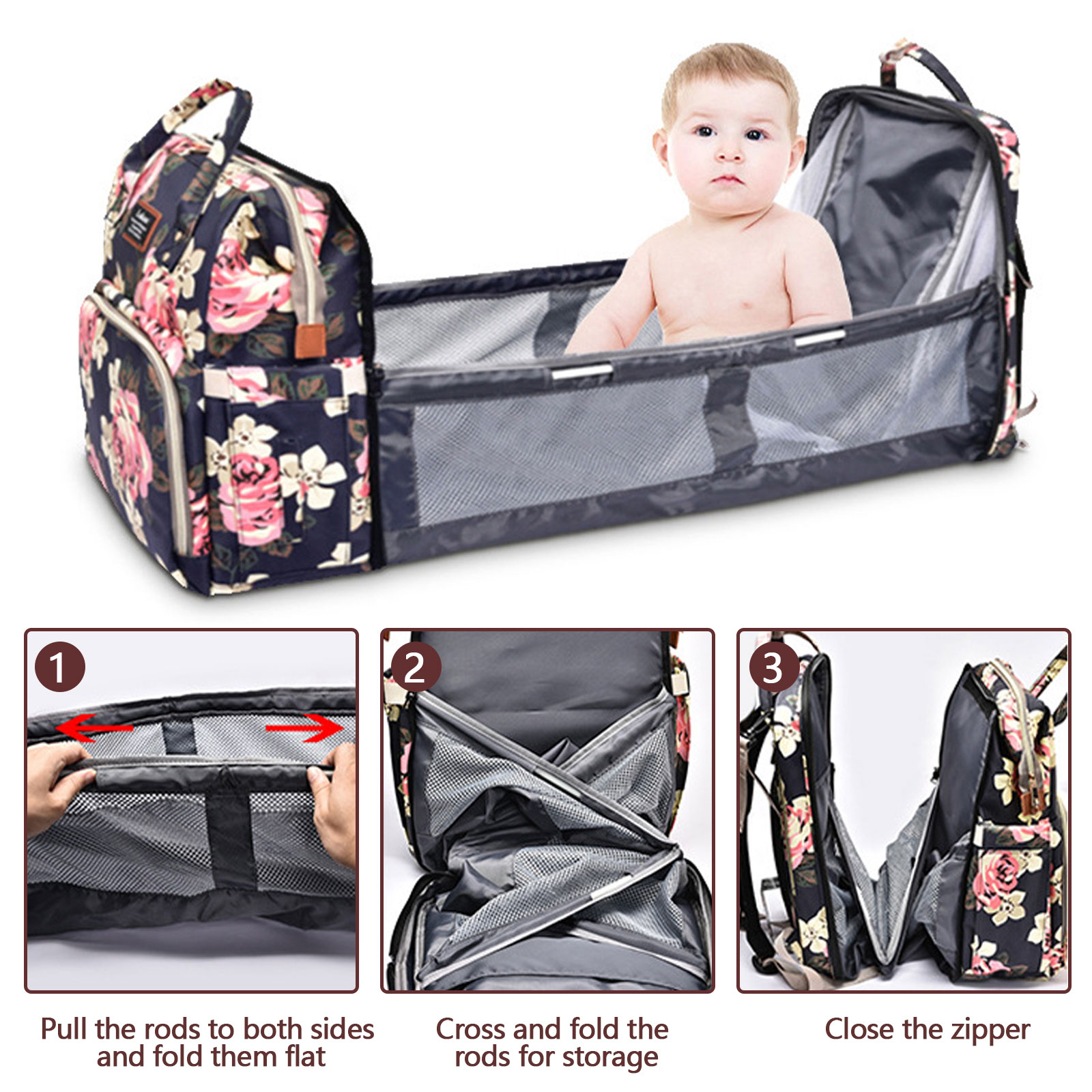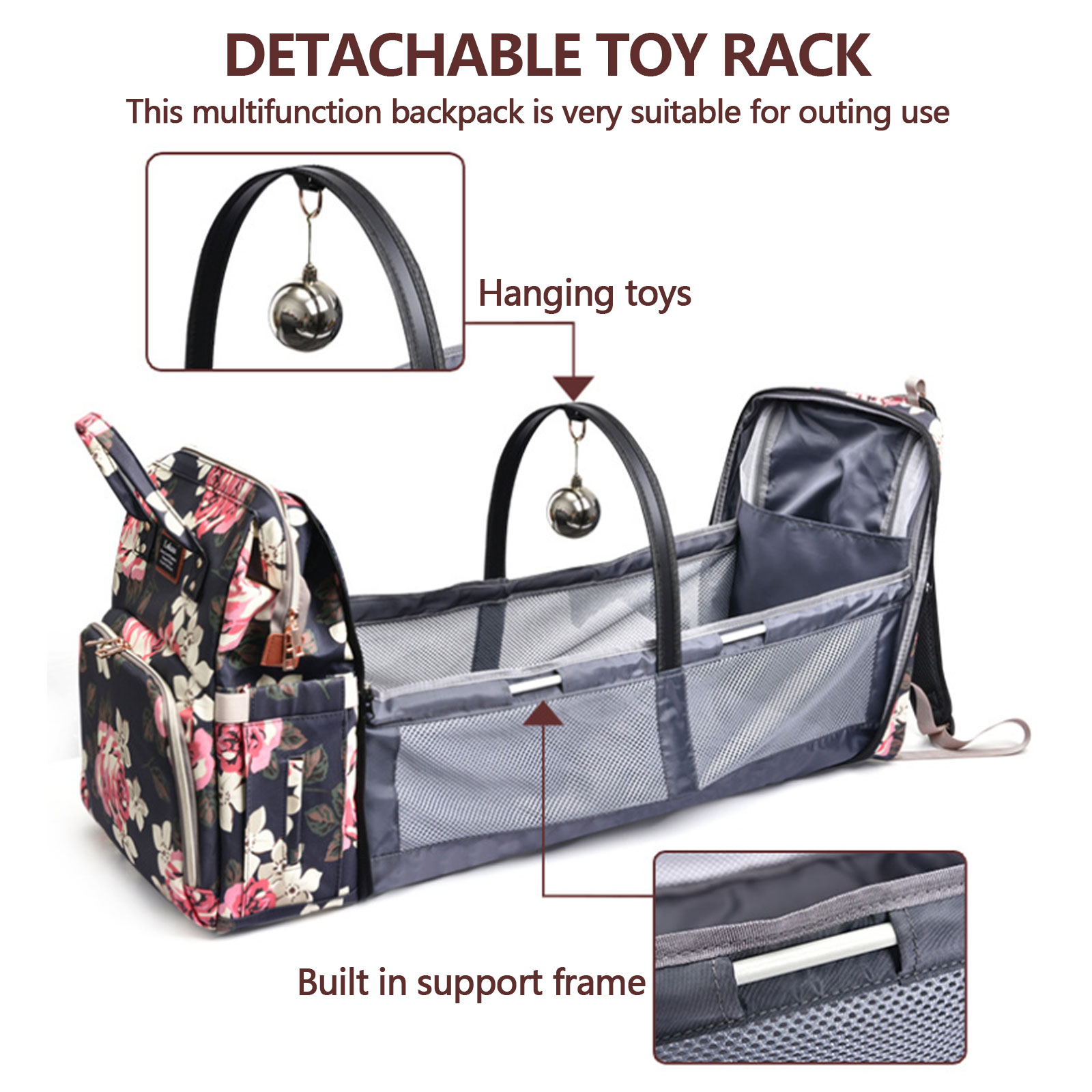 Портативная кроватка:Благодаря простой эксплуатации этот рюкзак можно превратить в кроватку с забором и поставляется с игрушечным баром, что позволяет ребенку спать более комфортно и защищает ребенка от падения.