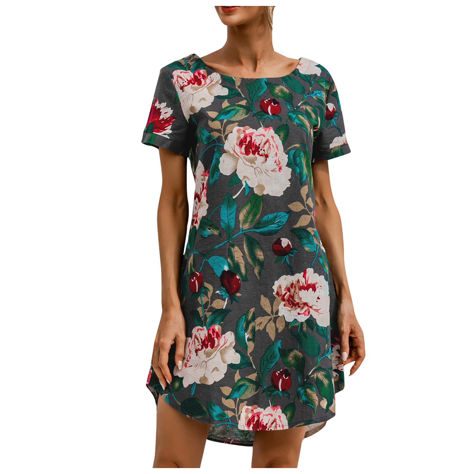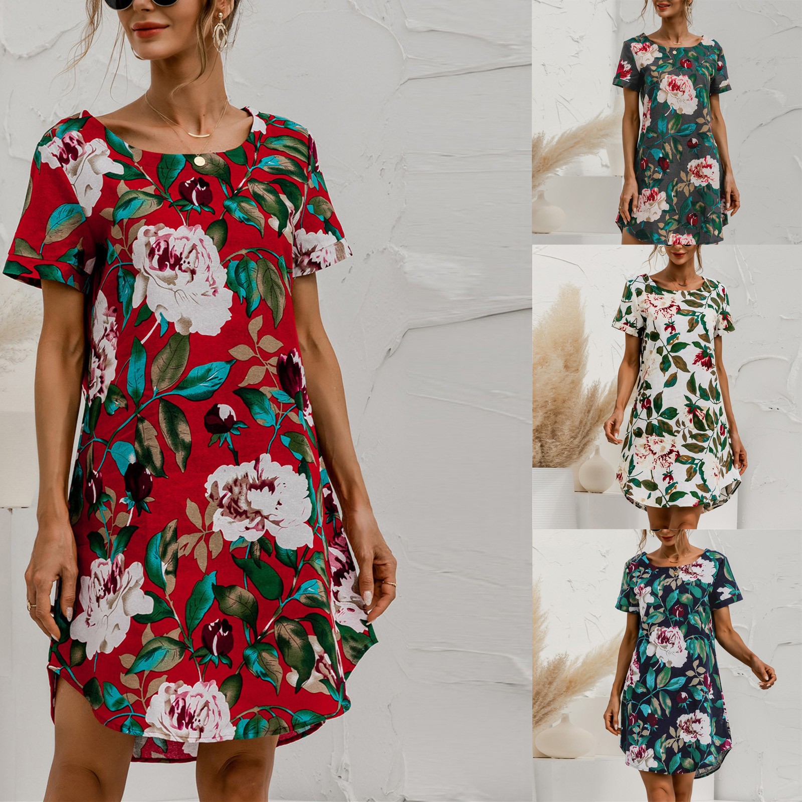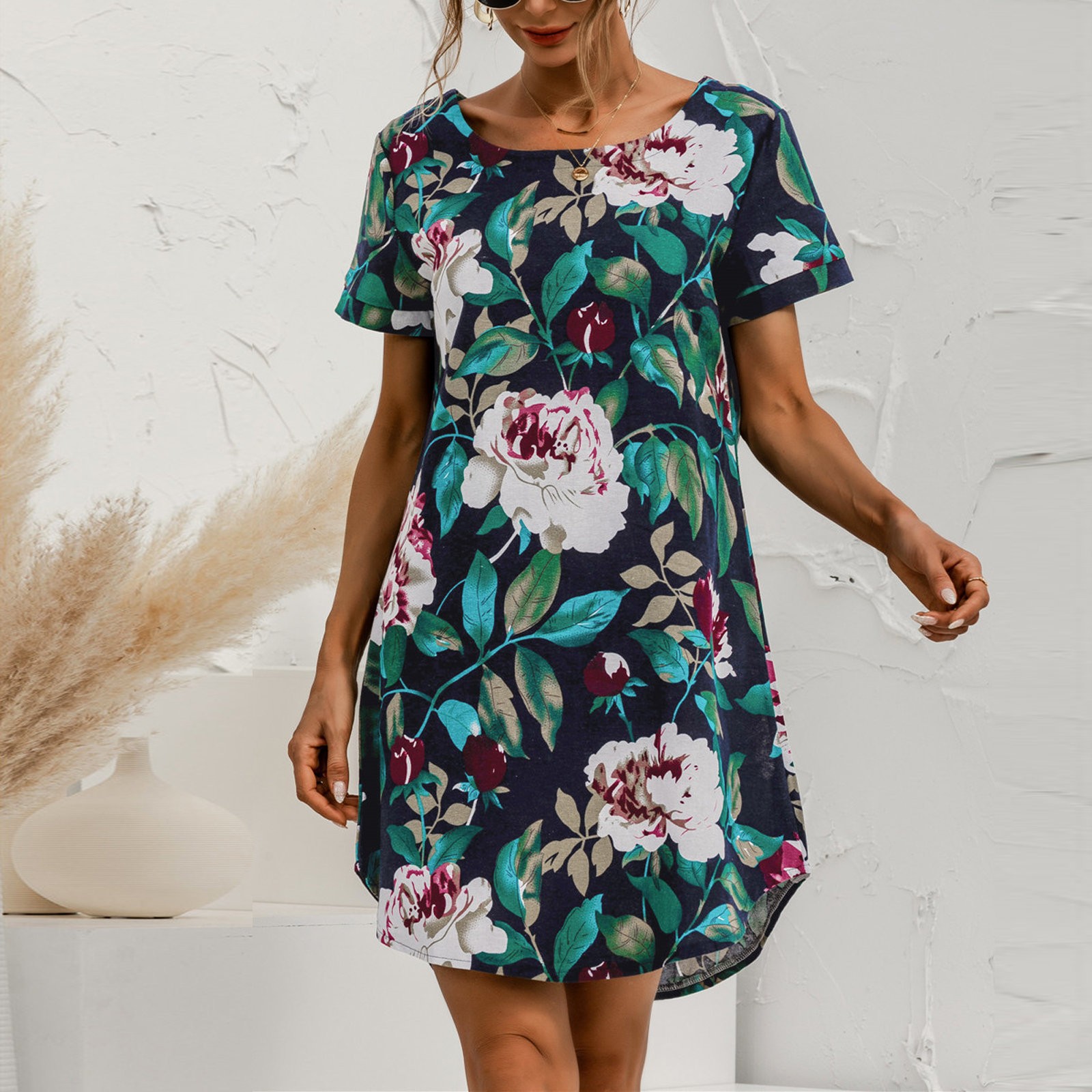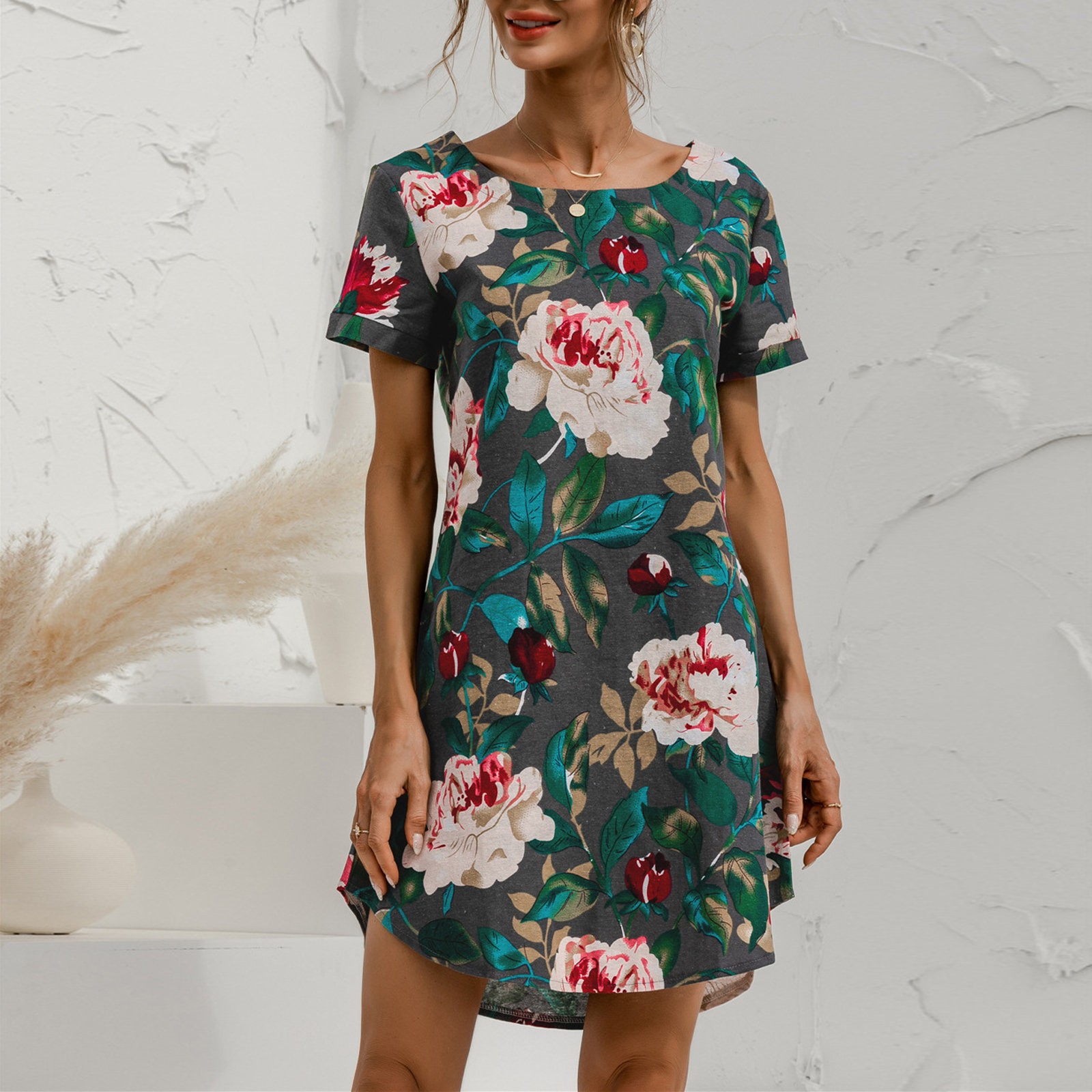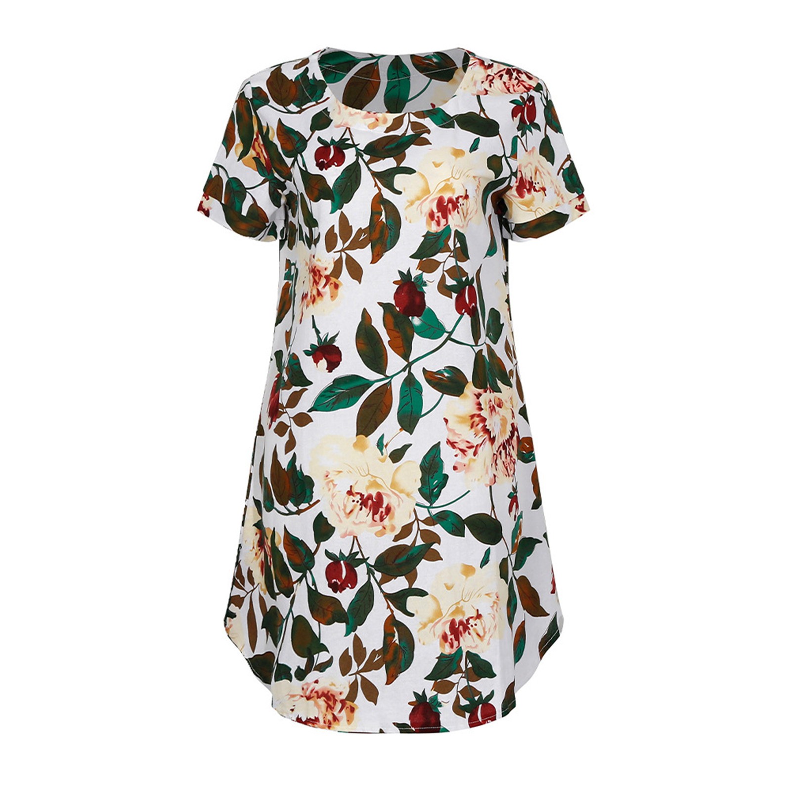 Женское повседневное свободное платье с коротким рукавом и круглым вырезом с цветочным принтом