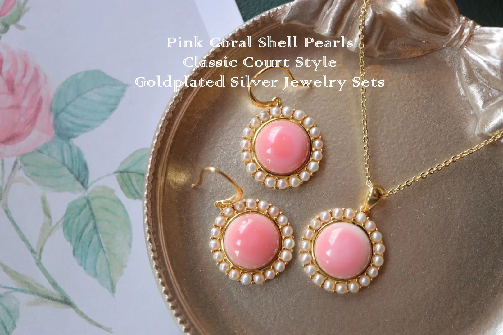 925 Стерлинговое серебро позолоченный розовый красный коралловый ракушка жемчуг классический трендовый стиль Ювелирные наборы для женщин (серьги-гвоздики и ожерелье с подвеской)