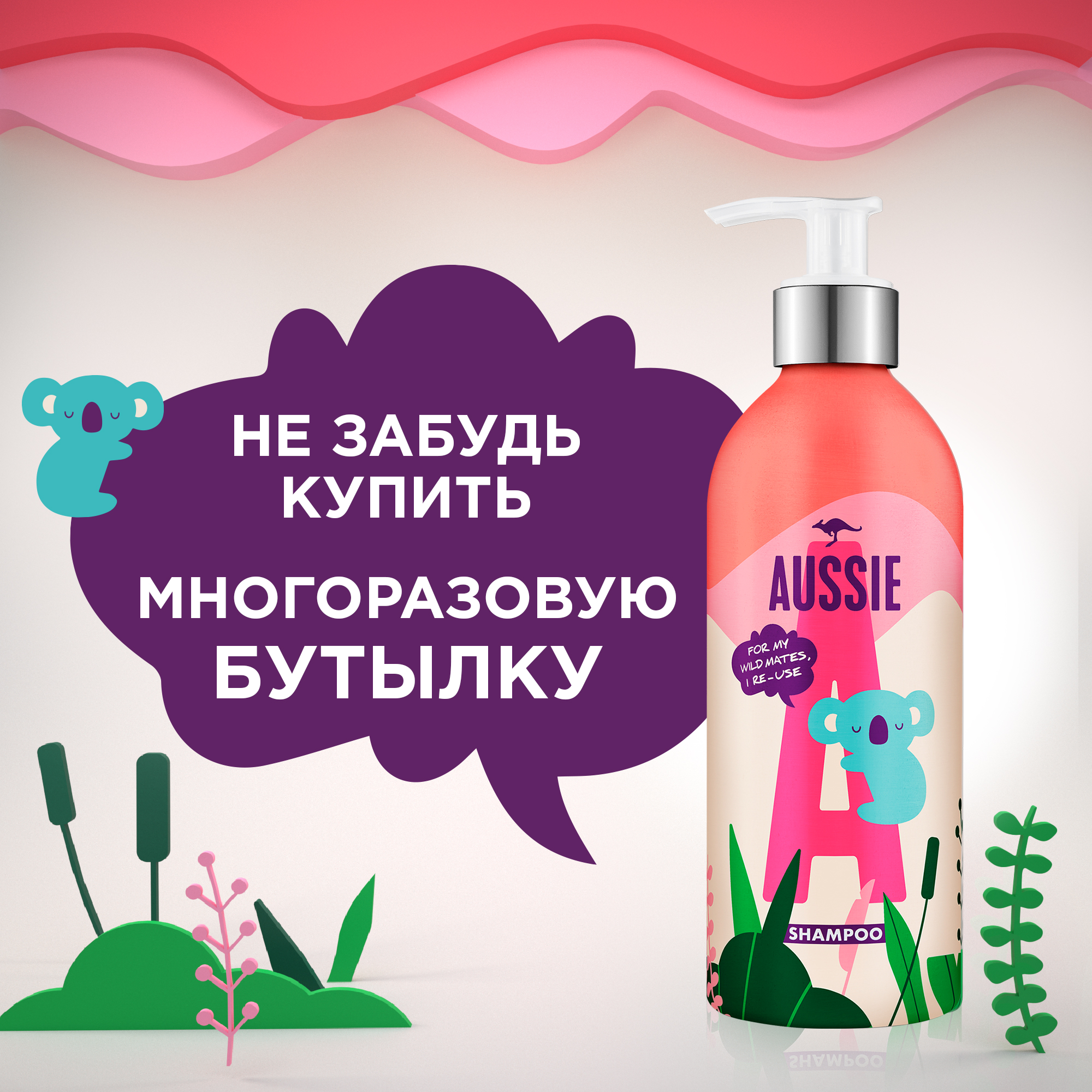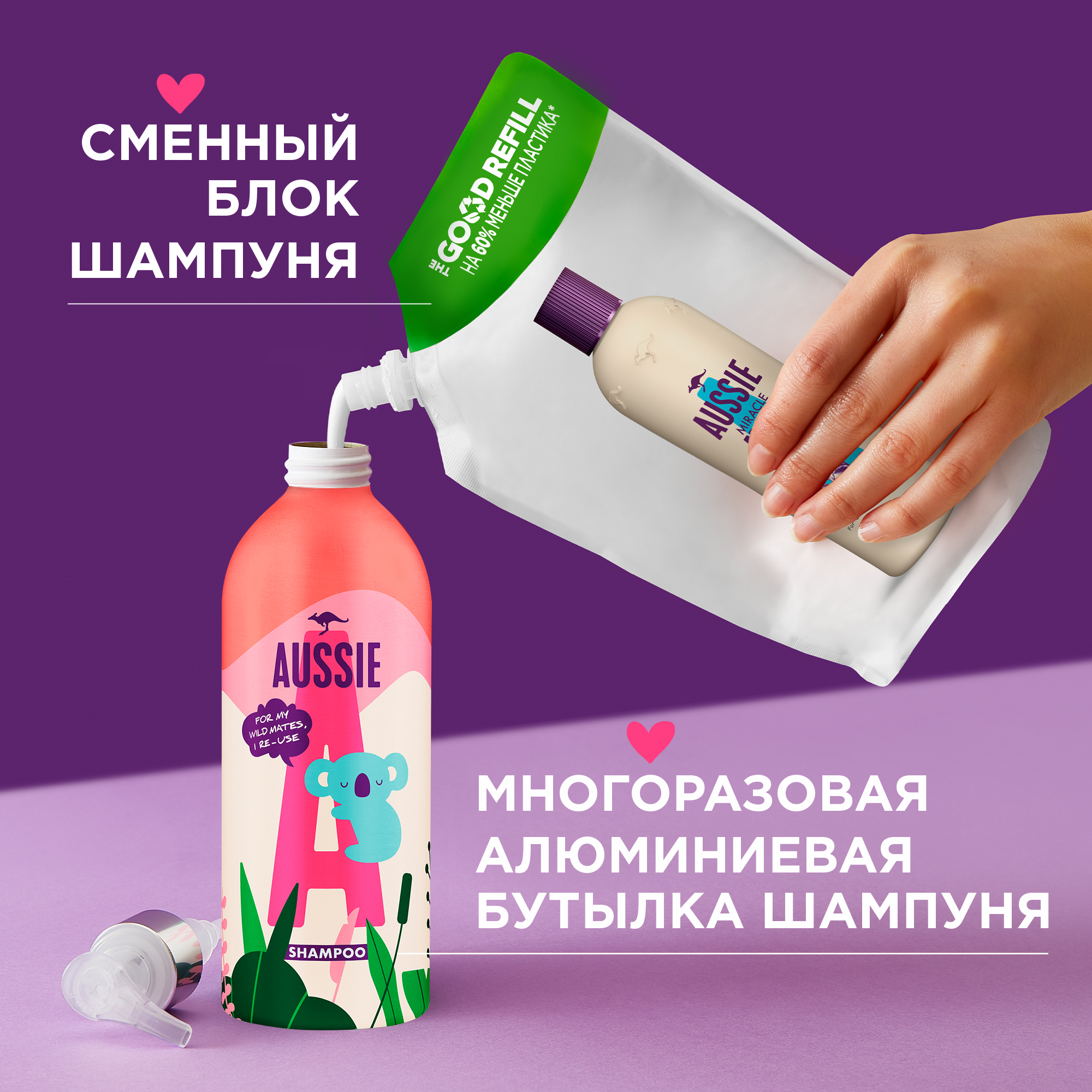 Инновация в уходе за волосами! Теперь любимый шампунь Aussie доступен в сменном блоке, который содержит на 60% меньше пластика (по сравнению с обычным флаконом шампуня). Коллекция Miraсle Moist утолит жажду сухих, поврежденных, склонных к пушению волос, подарив им настоящий водопад увлажнения. Уникальная формула содержит экстракт австралийского ореха макадамия, питательное масло которого превратит твои сухие волосы в мягкие, гладкие и увлажненные локоны. Сменный блок специально разработан для использования вместе с многоразовой алюминиевой бутылкой (покупается отдельно). Перейдя на использование многоразовой алюминиевой бутылки и сменного блока, ты поможешь уменьшить пластиковый след на планете. На 100% красивые волосы, на 60% меньше пластика (за мл, по сравнению со стандартной упаковкой бренда). Все продукты Aussie производятся без тестирования на животных по стандарту PETA. Aussie — это любовь с первого применения!