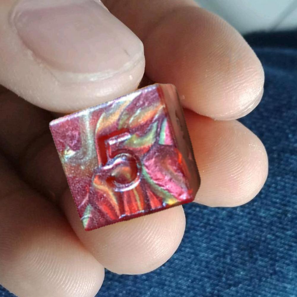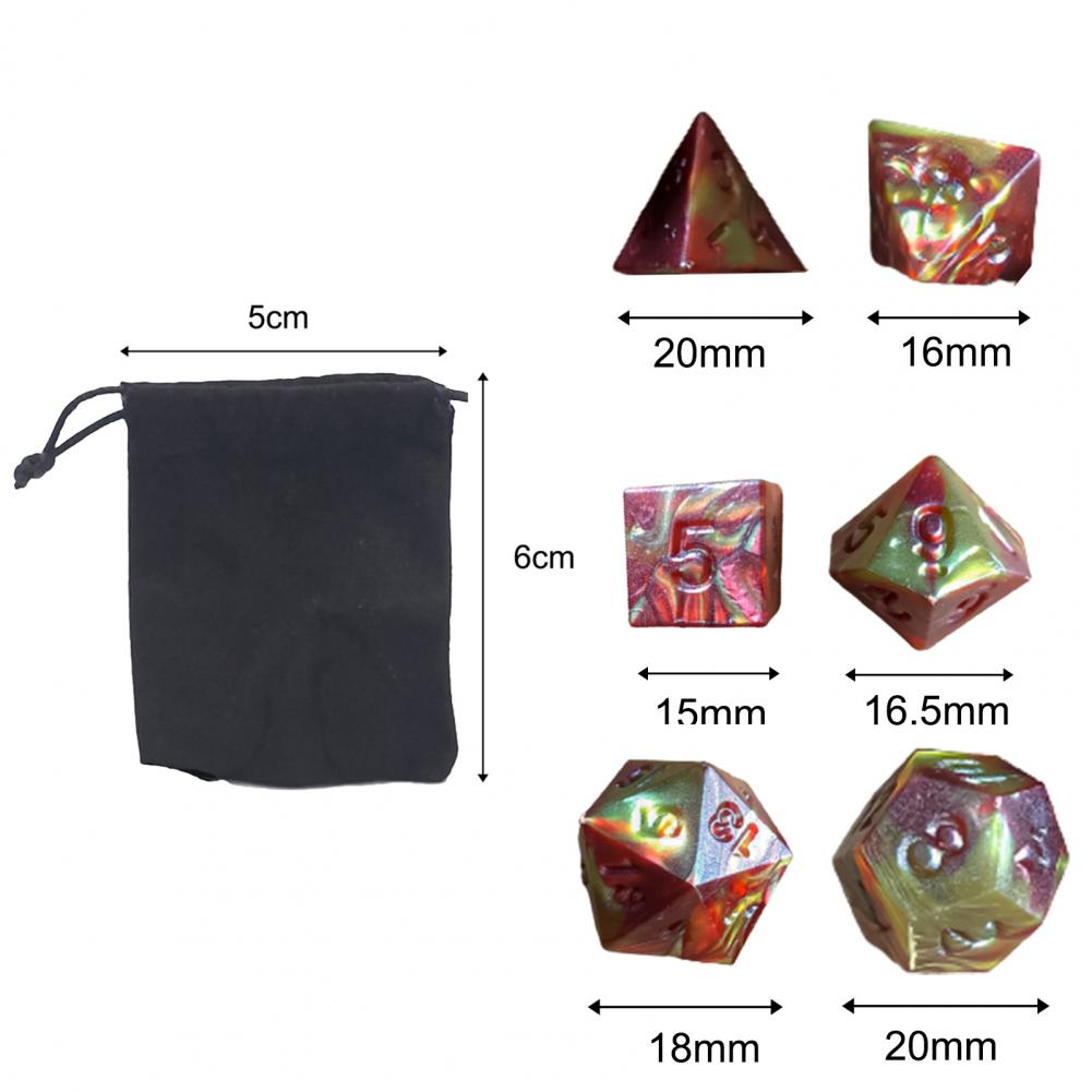 Противоположной стороны диаметр 4-стороннее плашка на 2 см, высота 1,7 см. Противоположной стороны диаметром 6-кубика-1,6 см. Противоположной стороны диаметр 8-кубика-1,5 см. Противоположной стороны диаметр 10-кости является 1,65 см, наконечник-to-диаметр наконечника-2,15 см. Противоположной стороны диаметр 12-кубика-1,8 см. Противоположной стороны диаметром 20-кубика составляет 2 см, диагональ диаметр 2,3 см.